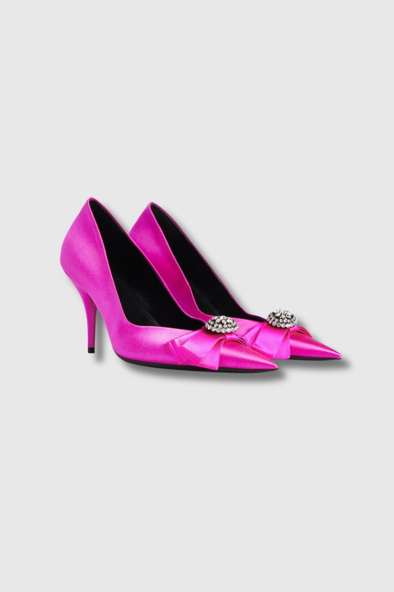 These Avenue Palazzo pumps in satin and fuchsia pink jewels by Balenciaga embody spectacular elegance and resolute couture. Crafted from viscose and silk, they feature an elongated pointed toe and an iconic 90 mm knife heel that boldly slims the silhouette.