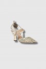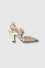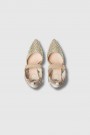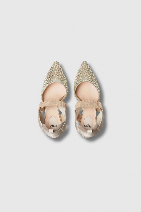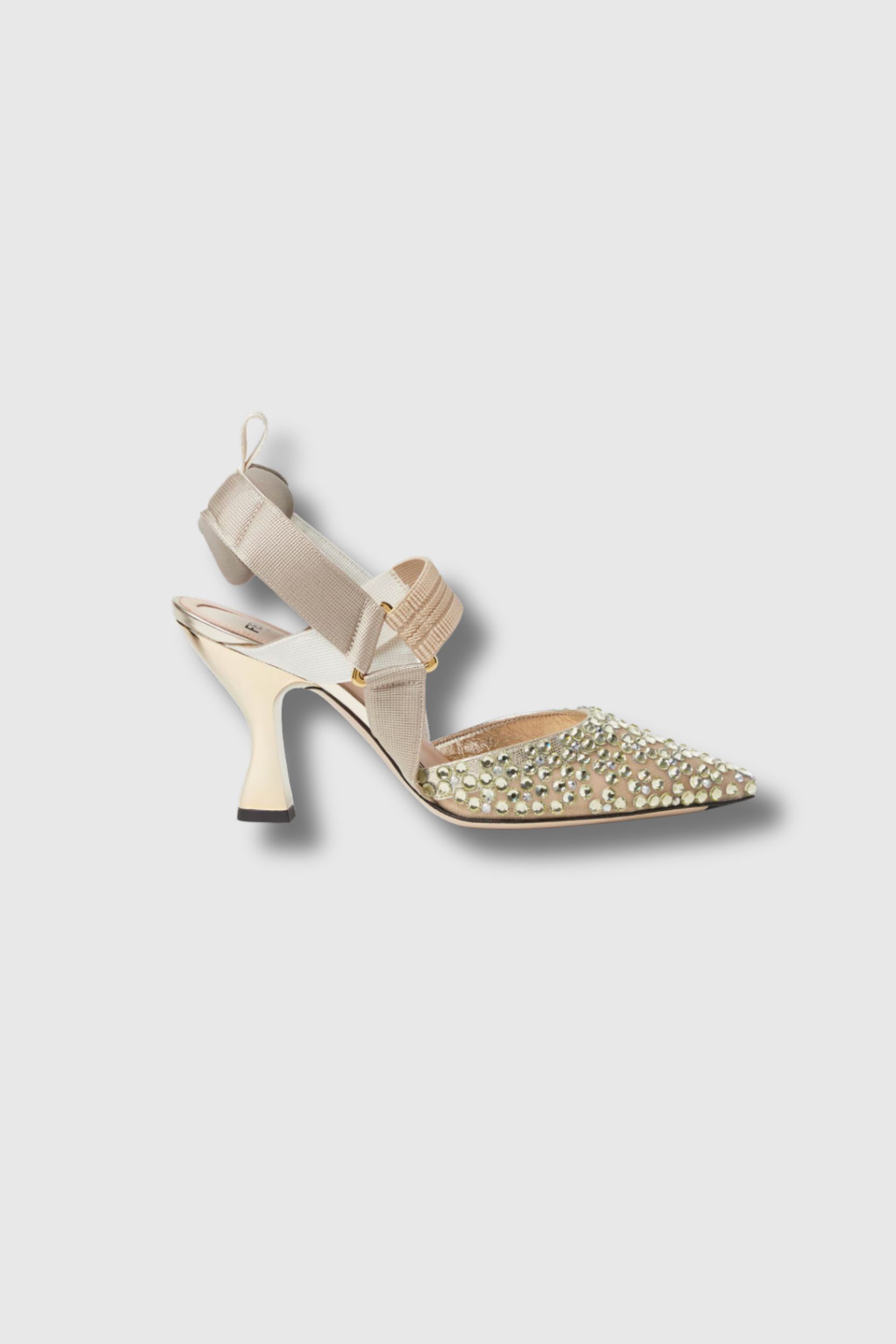 These beige Colibrì pumps with rhinestones are by Fendi. Featuring a sleek, feminine silhouette, they are defined by elastic straps that wrap around the foot. Crafted from nude mesh, they are adorned with light green crystals arranged in delicate floral patterns. The rubber-insert sole, padded cushion, and trekking-style hook add a sporty touch, contrasted by a gold-tone galvanized heel for a refined and modern look.