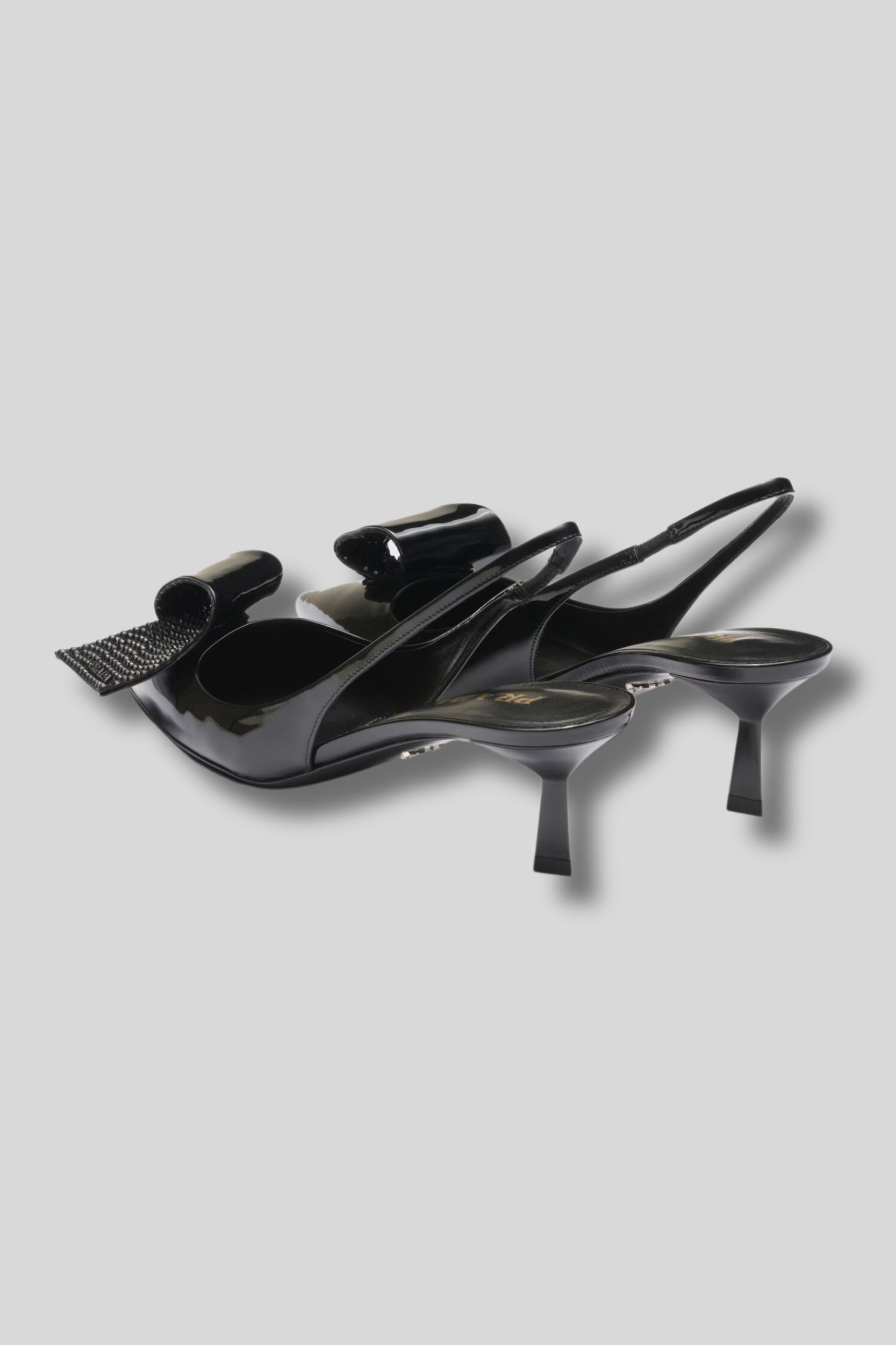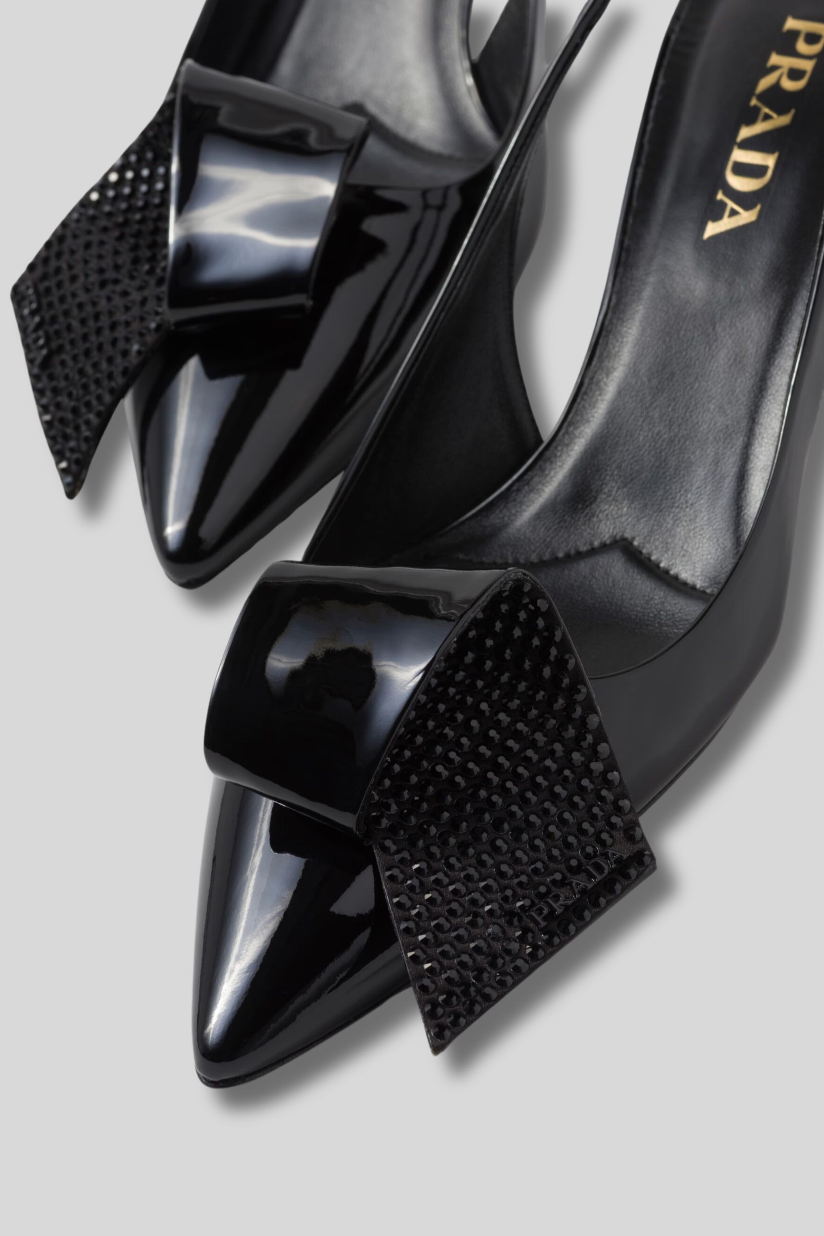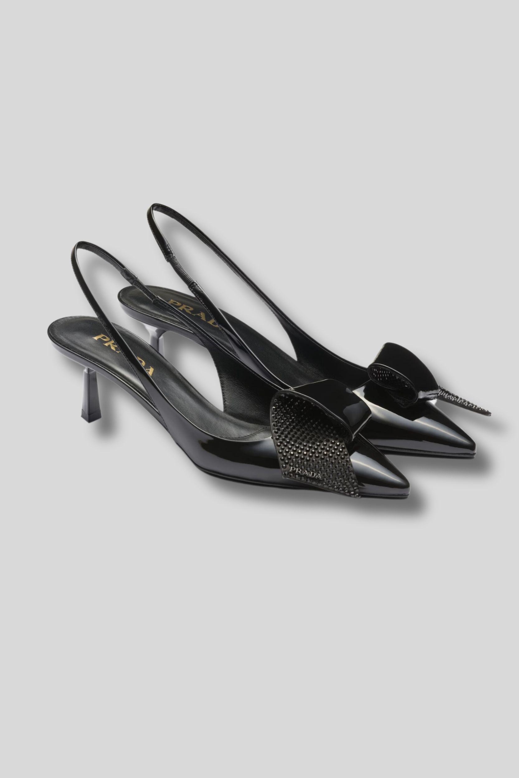 These black patent leather slingback pumps are designed by the Italian house Prada. They have a geometric heel and feature an architectural-inspired embellishment, embellished with tone-on-tone fancy crystals.