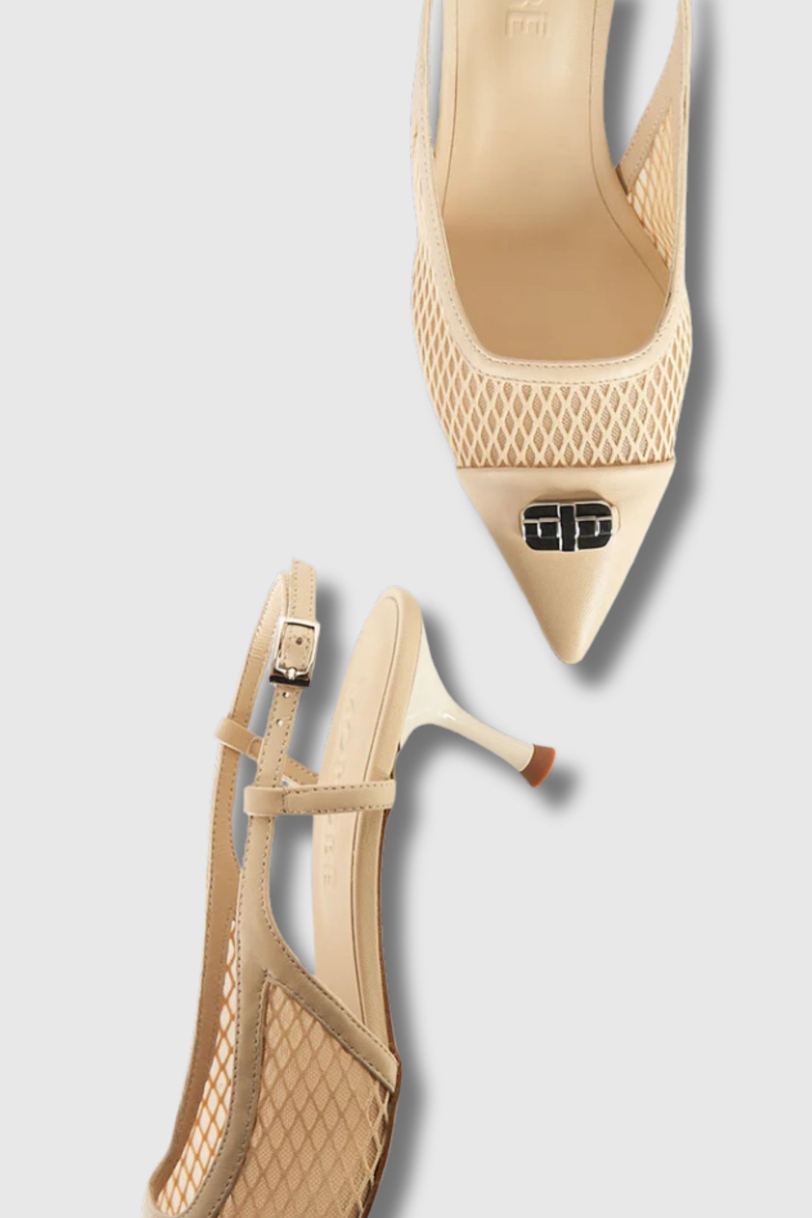 These Delilah 01 nude mesh slingback pumps are designed by Morobe. They feature a mesh design, an adjustable ankle strap, a pointed toe and the house logo in gold on the front of the shoe.