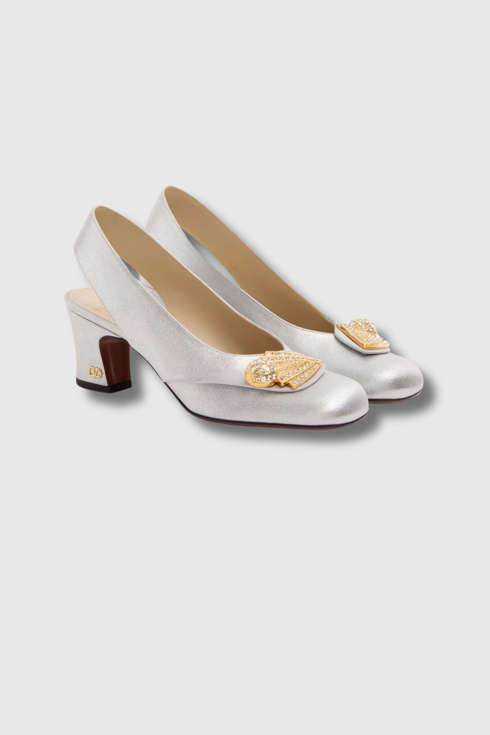 These silver-toned laminated Adamantine slingbacks are designed by Valentino Garavani. They feature a sequined fabric back strap and are accessorised with jewelled crystals on the front of the shoe.
