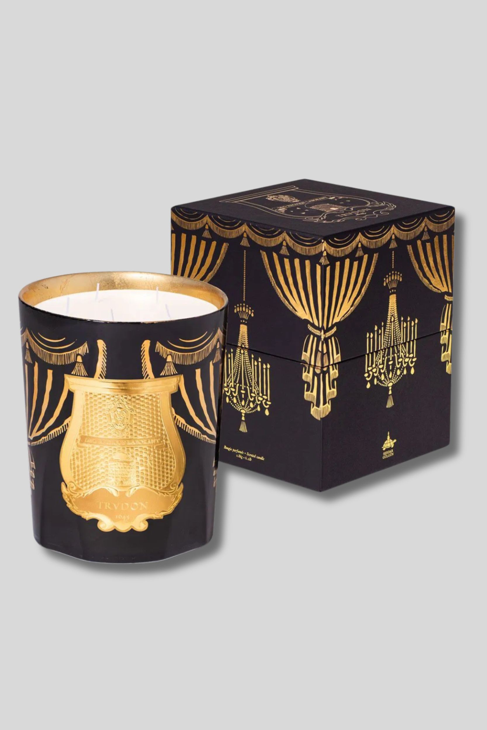 For Christmas, Trudon celebrates the splendor of Versailles, reminiscent of the balls held by Louis XV. The four scented candles embody a royal lifestyle, adorned with 24-karat gold leaf inside and stylish chandeliers outside. With warm gold decorations framing the royal crest, they reveal woody notes of **Fir**. Presented in a matte black box that highlights opulent hot-stamped designs, they invite you to join the festivities.