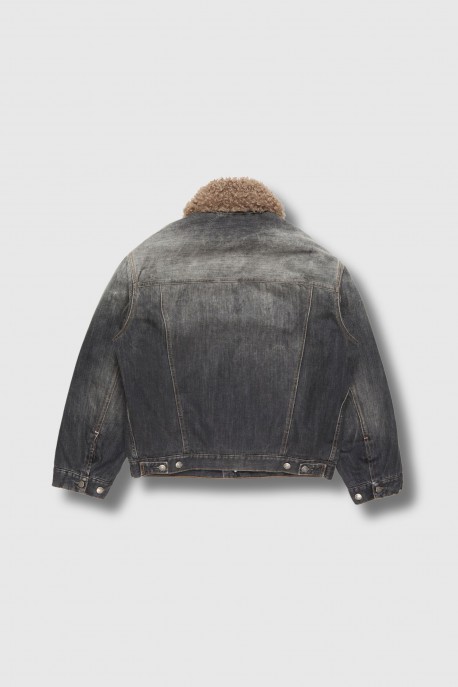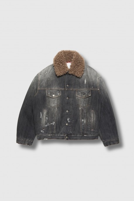 This Robert U Black Trafalgar jacket is designed by Acne Studios. Crafted from supple black denim, it features an intense wash with striking contrasts, enhanced by hand-applied dirt and paint marks, making each piece unique. The faux sheepskin collar adds a retro, warm touch, while the padded lining ensures optimal comfort.