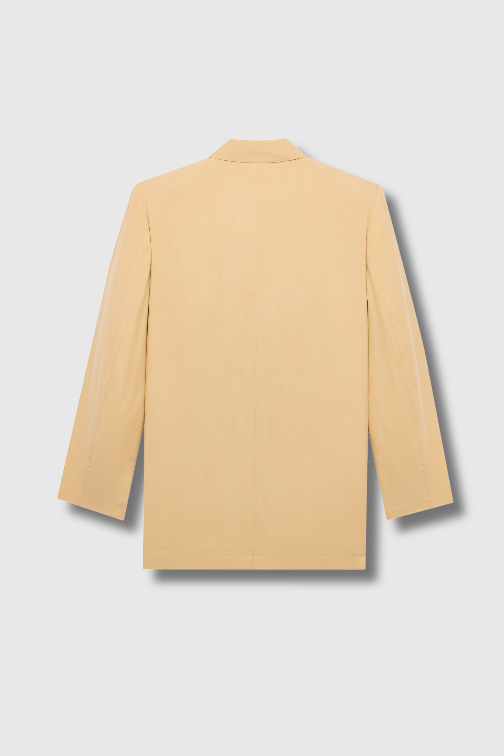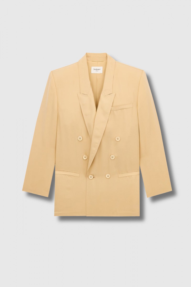This beige Haboutaï jacket is by Saint Laurent. Designed in a straight double-breasted cut, it features six buttons, peak lapels, and padded shoulders for a structured silhouette. With welt pockets on the front and chest, it is fully lined in silk, ensuring a refined and elegant finish.