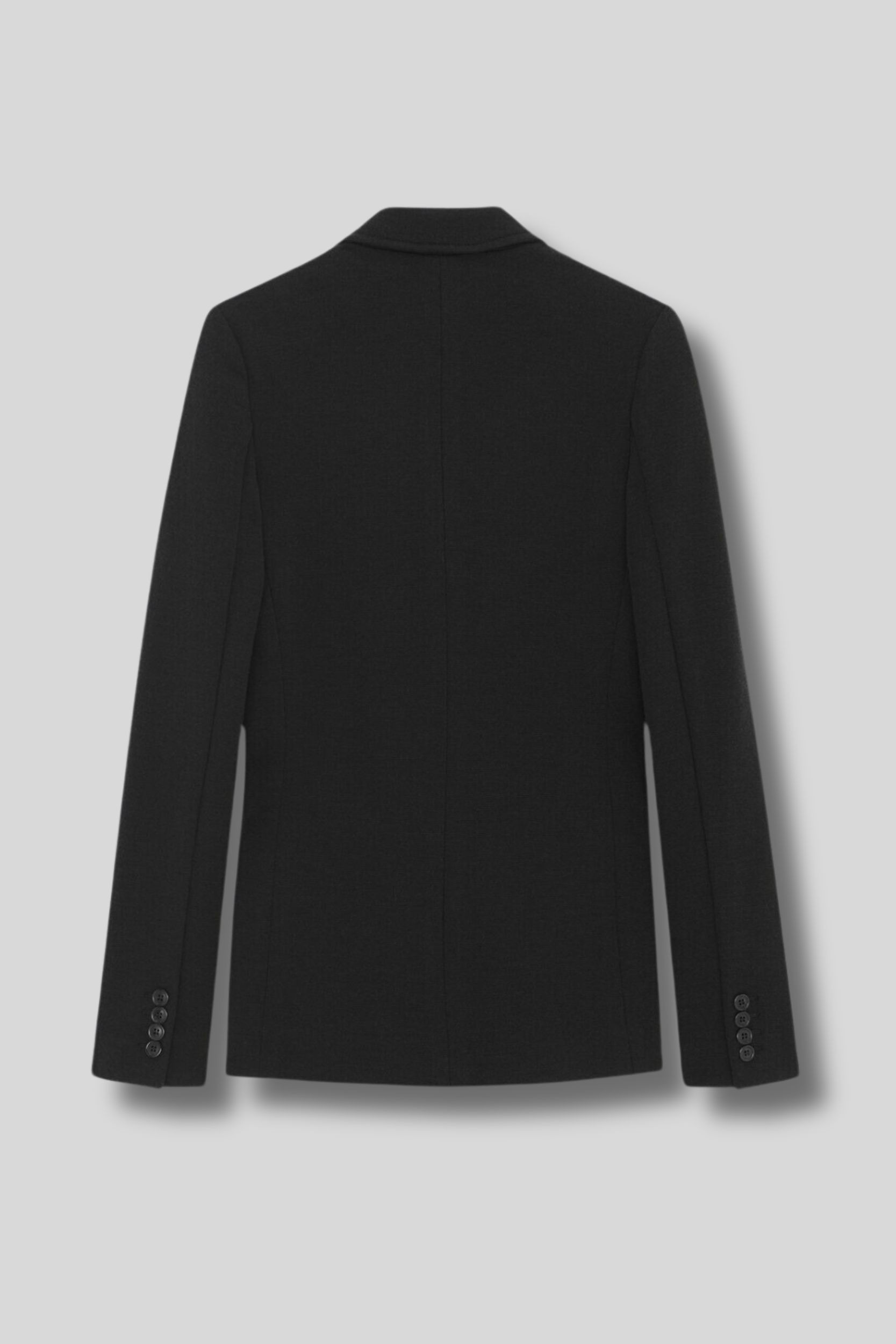 This black wool jersey Saharienne jacket is designed by Saint Laurent. It features four flap pockets, a double-breasted front closure and epaulets. Silk lining