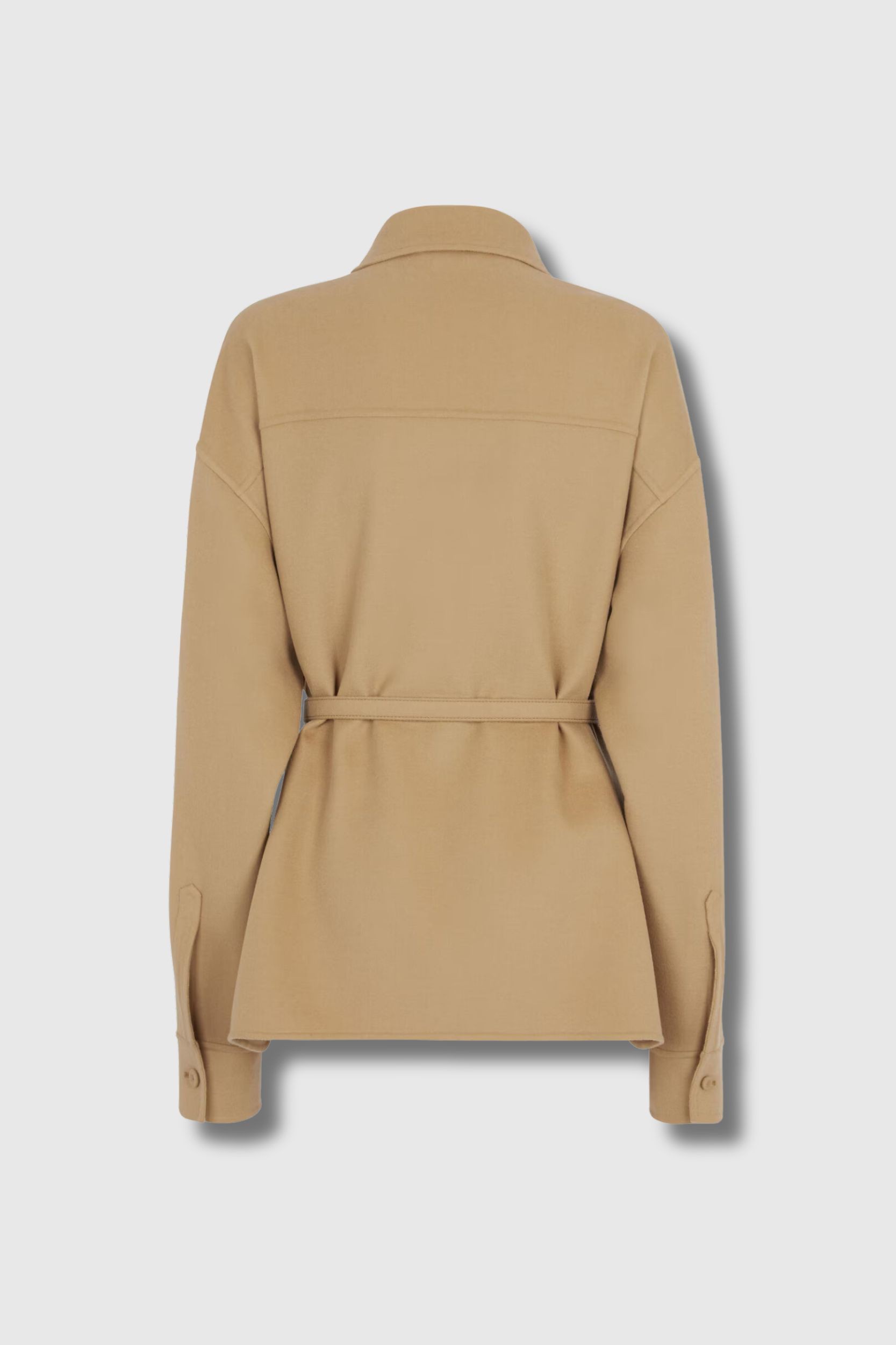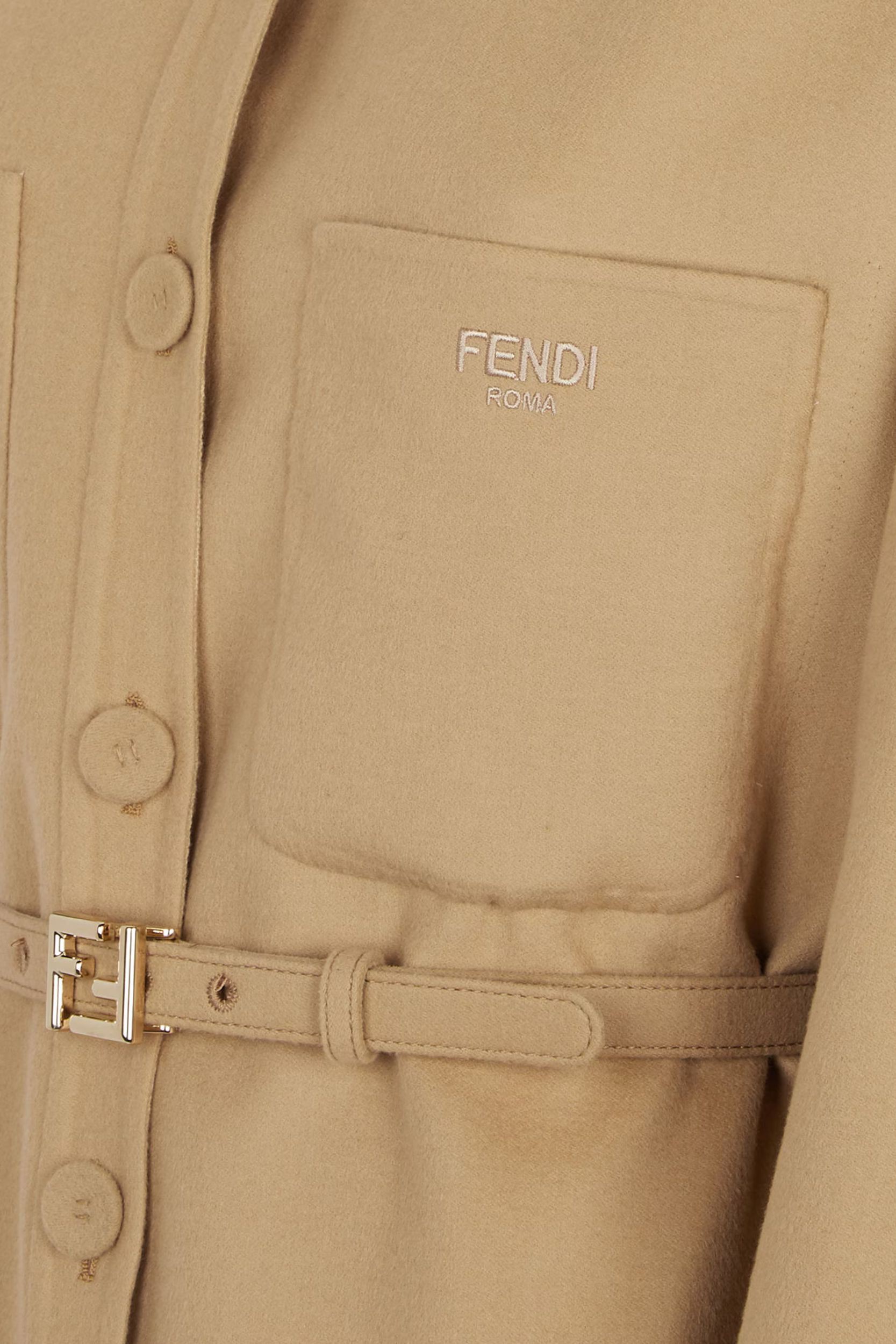 This beige wool Go-To jacket is designed by Fendi. It features a shirt collar and low armholes. This piece is detailed with a tonal belt with a gold FF buckle and "Fendi" embroidered on the chest.