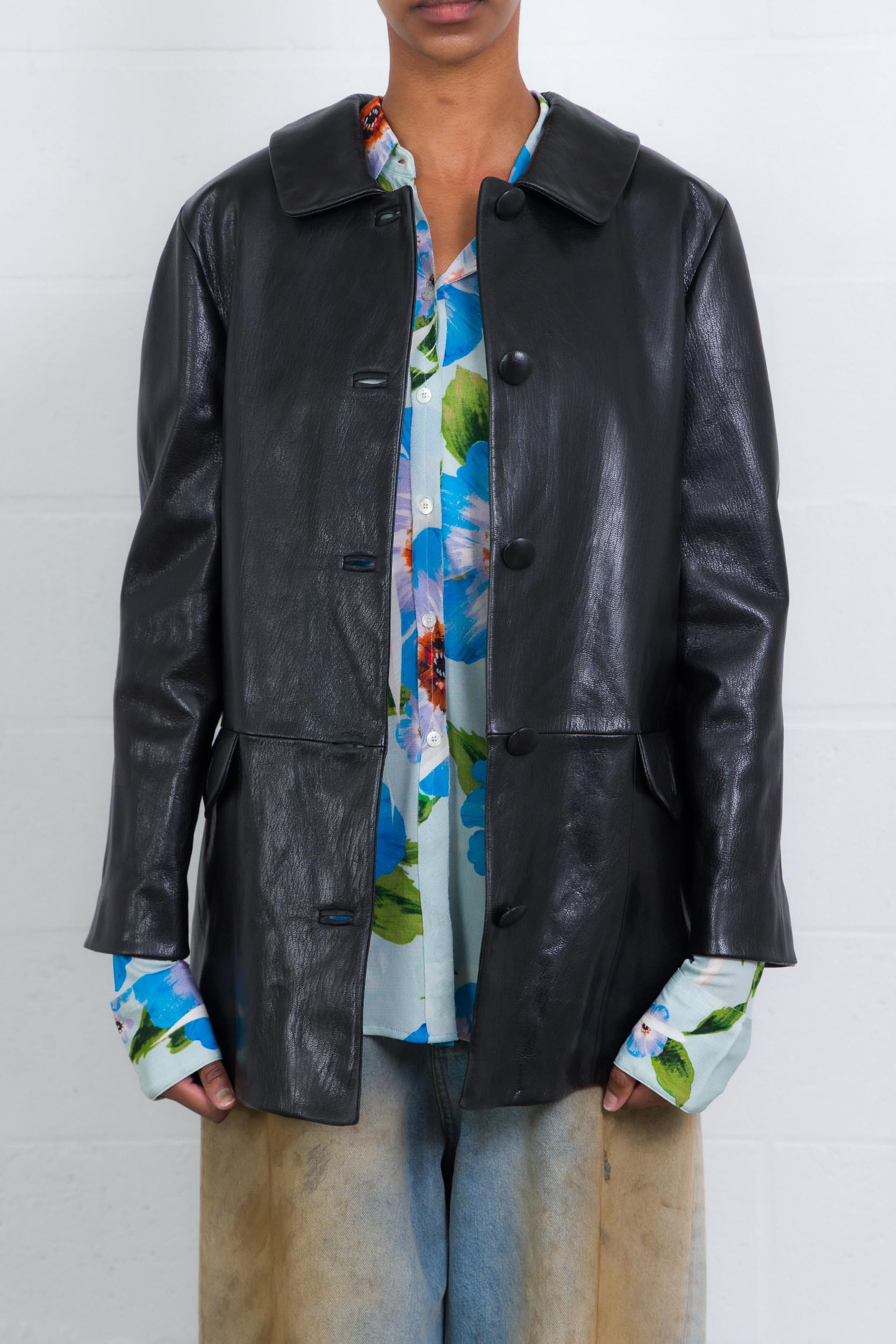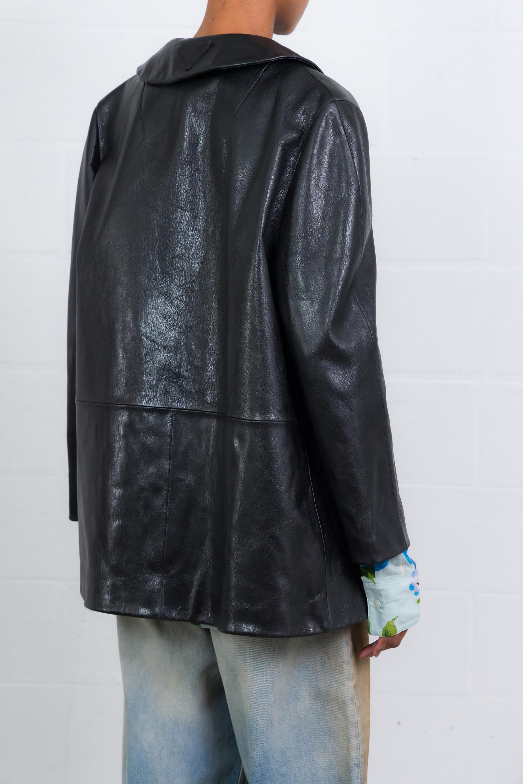 This black goatskin leather pea jacket is designed by Prada. It features a buttoned fastening, a shirt collar and side flap pockets. It has a straight fit and a waxed finish.