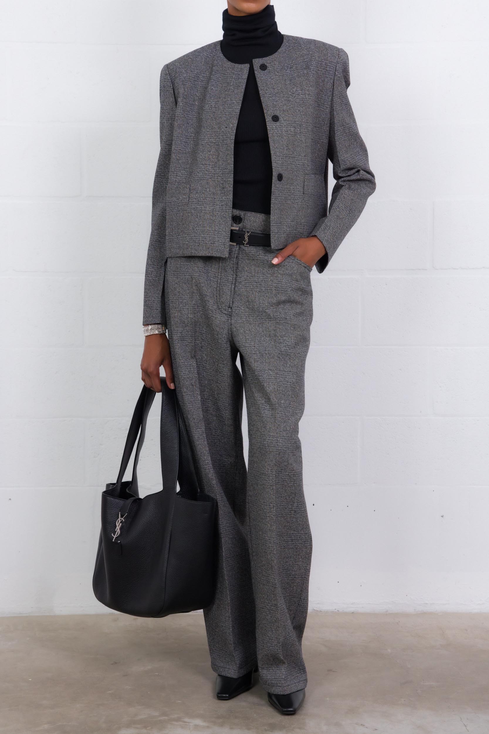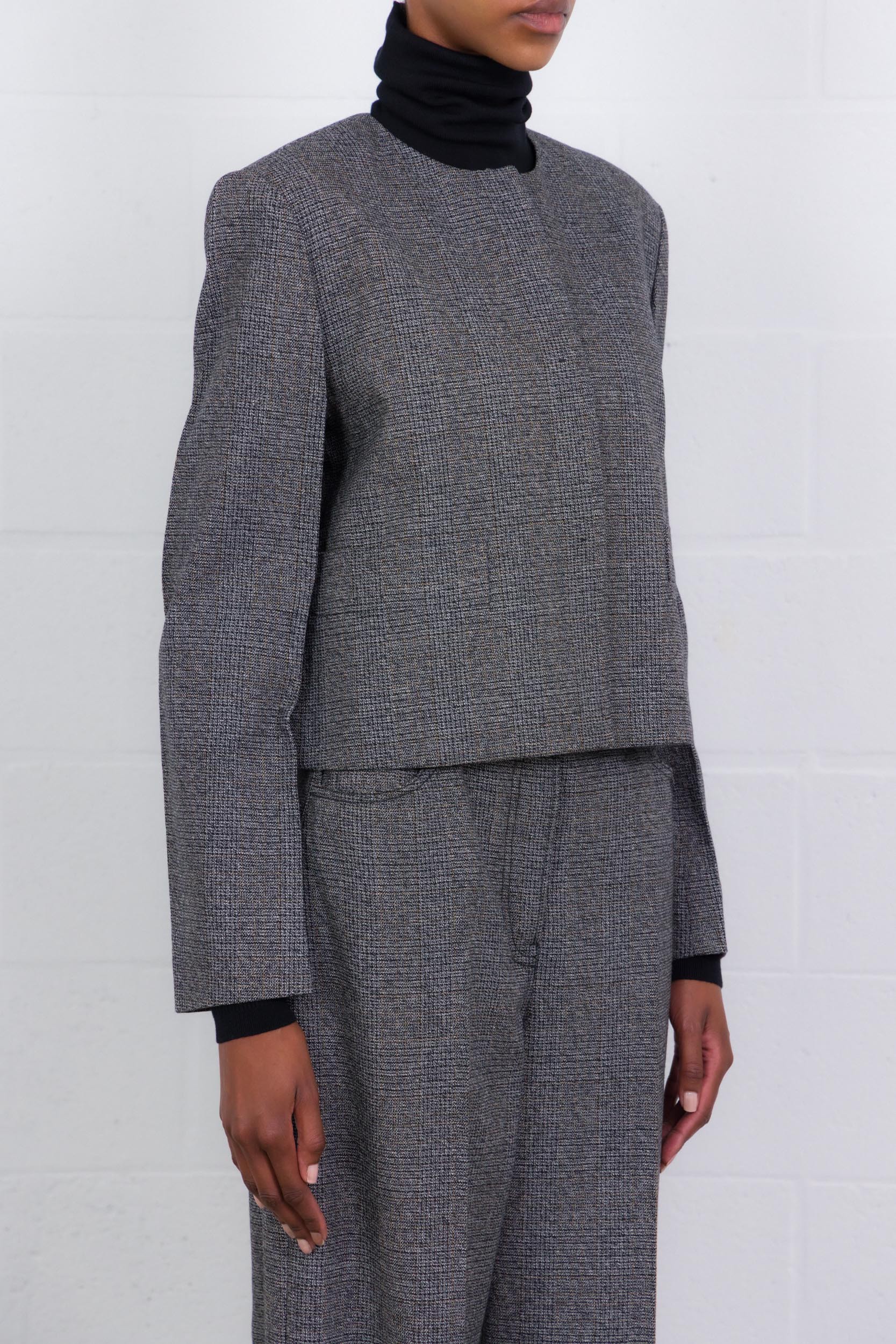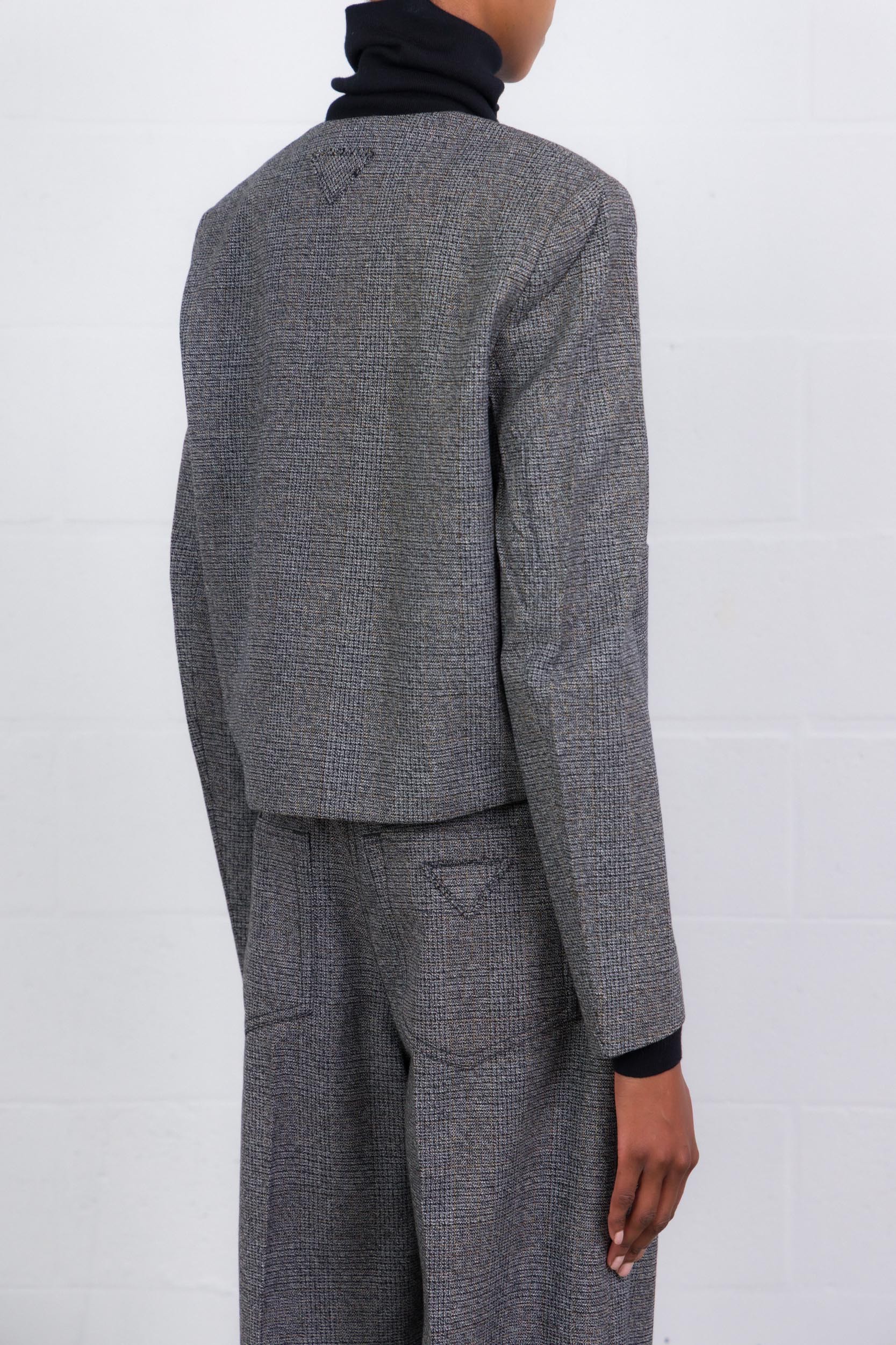 This short houndstooth jacket is designed by Prada. The timeless Prince of Wales pattern is reinvented in a lighter version with straight, balanced lines. An instinctive, refined and subtly abstract elegance that retains all its material strength and contemporary sophistication.