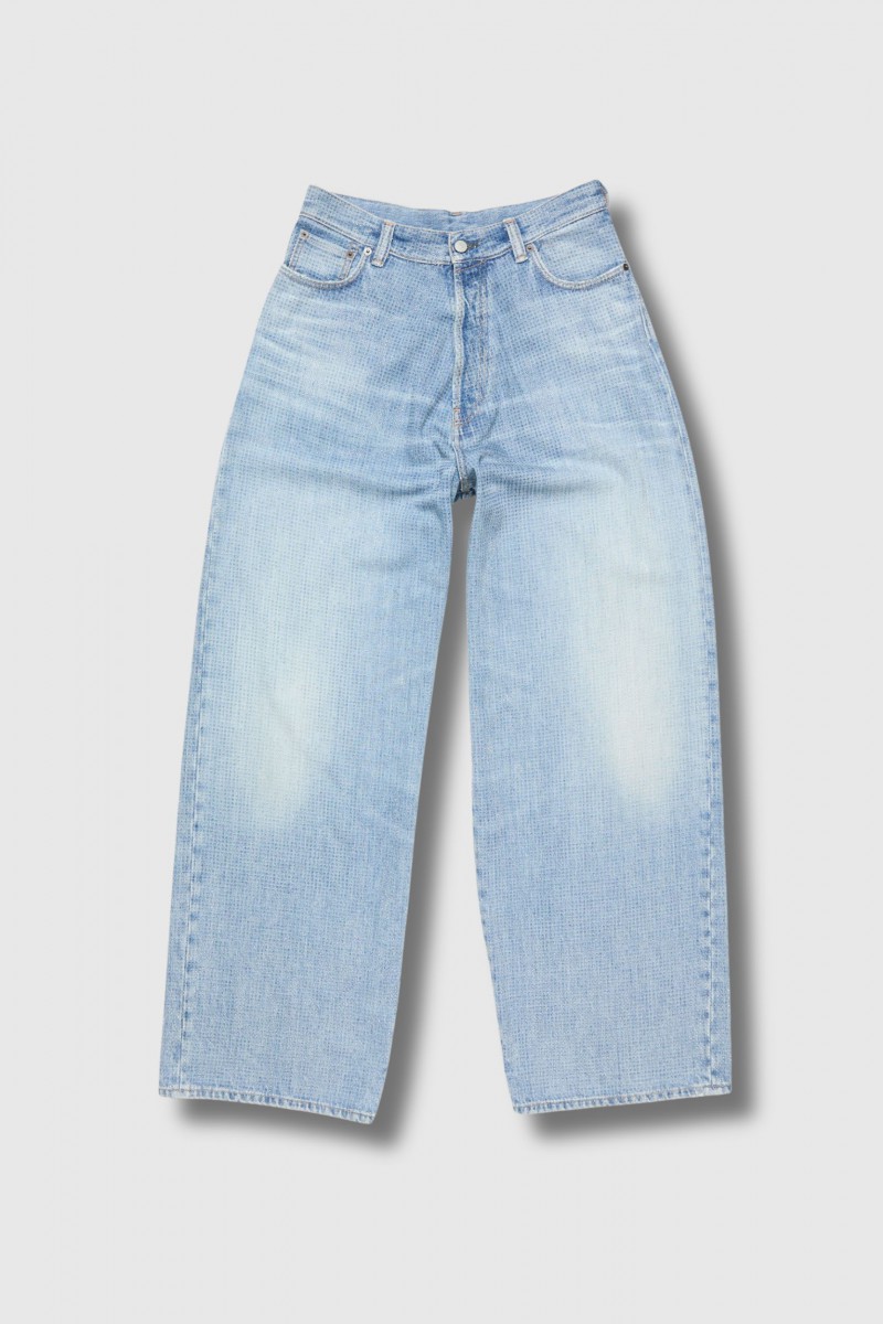These 2023 Shimmy Dawn jeans are designed by Acne Studios. They feature a relaxed, loose fit with a low waist and very wide legs for a decidedly contemporary look. Crafted from a fluid cotton blend, they are distinguished by their eco-friendly stone wash and mineral dye for a subtle distressed effect. Hand-applied rhinestones give each pair a unique textured shine. A bold creation, perfectly blending street style with couture glamour.