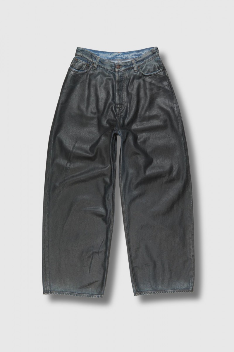 These black leather-finished jeans by Acne Studios are crafted from faded indigo Tencel denim and feature a black pressed leather finish for a modern, bold look. They feature the brand's iconic 2023 cut, with a loose, super baggy silhouette, low waist and extended length. With a classic five-pocket design and button fly, they combine workwear inspiration with contemporary aesthetics.