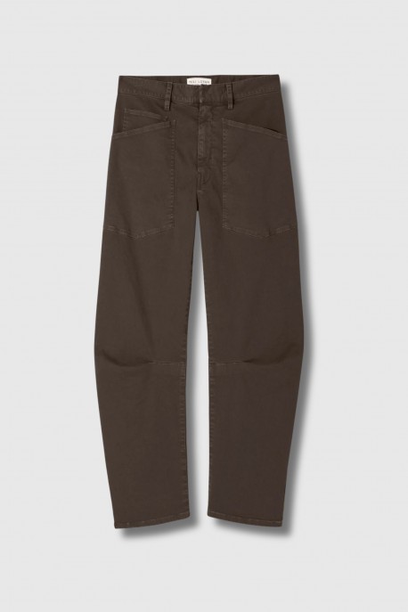 These brown Shon jeans designed by Nili Lotan offer a unique silhouette thanks to their mid-rise cut and loose, structured barrel shape. Their subtly curved volume, knee cut-outs and crotch gusset give them a bold style. A zip fastening with concealed hooks, topstitched patch pockets and belt loops complete this model with its utilitarian and modern charm.