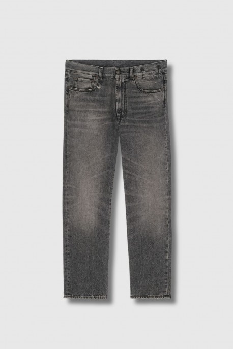 These black Leyton Boyfriend Jeans by R13 are crafted from faded black denim for a casual, authentic style. They feature a relaxed boyfriend fit with a zip fly and metal button engraved with R13, belt loops, and five classic pockets. A leather label embossed with the R13 logo on the back completes this iconic design.