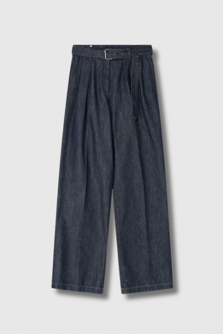 These Peaches bis denim pants by Dries Van Noten feature a structured yet relaxed look. Crafted from denim, they have a loose, high-waisted fit with straight legs. Irregular pleats add texture and an architectural touch to the silhouette, while the integrated waistband emphasizes the waist. Featuring side pockets and piped back pockets, they fasten at the front for a clean finish. A statement piece, faithful to the brand's contemporary and sophisticated aesthetic.