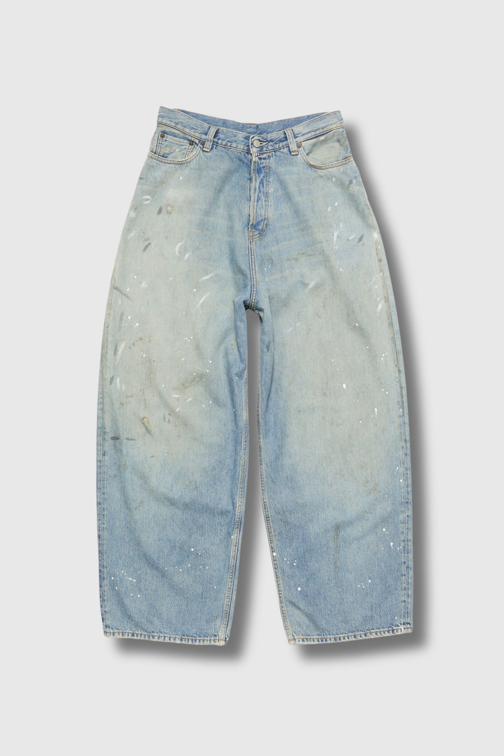 These blue Trafalgar jeans by Acne Studios revisit denim with a bold, contemporary aesthetic. Crafted from faded non-stretch denim, they feature intentional paint splatters and stains for an artistic and unique effect. Their super baggy fit, mid-rise waist, extra-wide leg and extended length create a loose and modern silhouette. Featuring a button fly and five-pocket construction, these jeans combine statement style with everyday practicality.