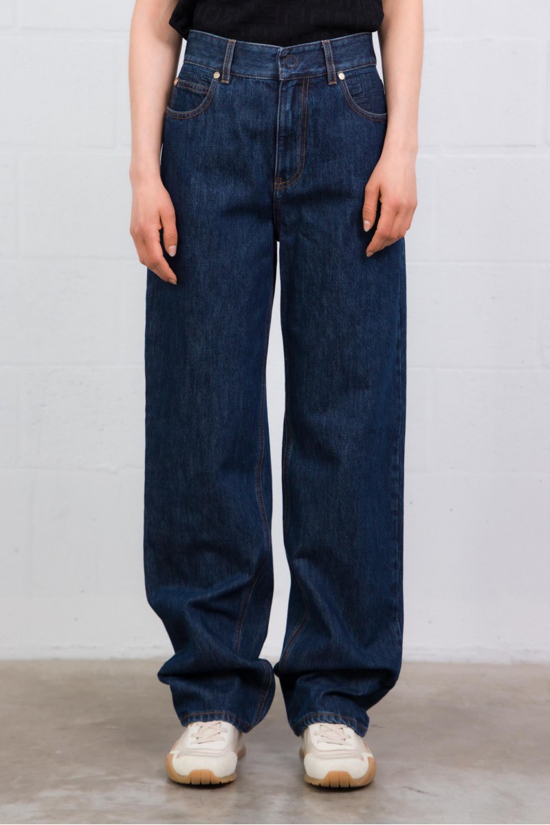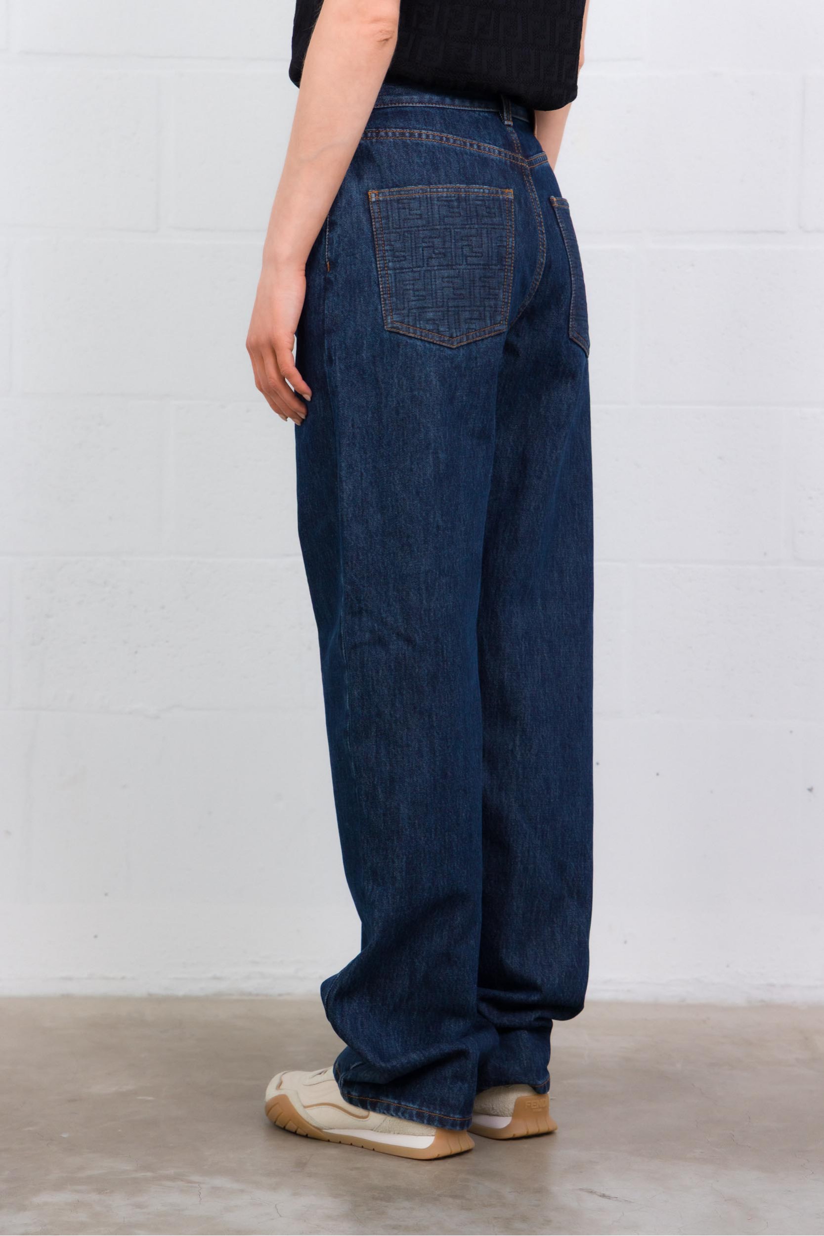 The FF blue denim jeans by Fendi reimagine classic denim with contemporary elegance. These high-waisted five-pocket trousers feature a wide, straight-leg cut for a structured silhouette. Crafted from dark blue denim, they are distinguished by a quilted FF motif on the right and back pockets, contrasting topstitching, and palladium-finish metal rivets, reflecting the House’s refined signature.