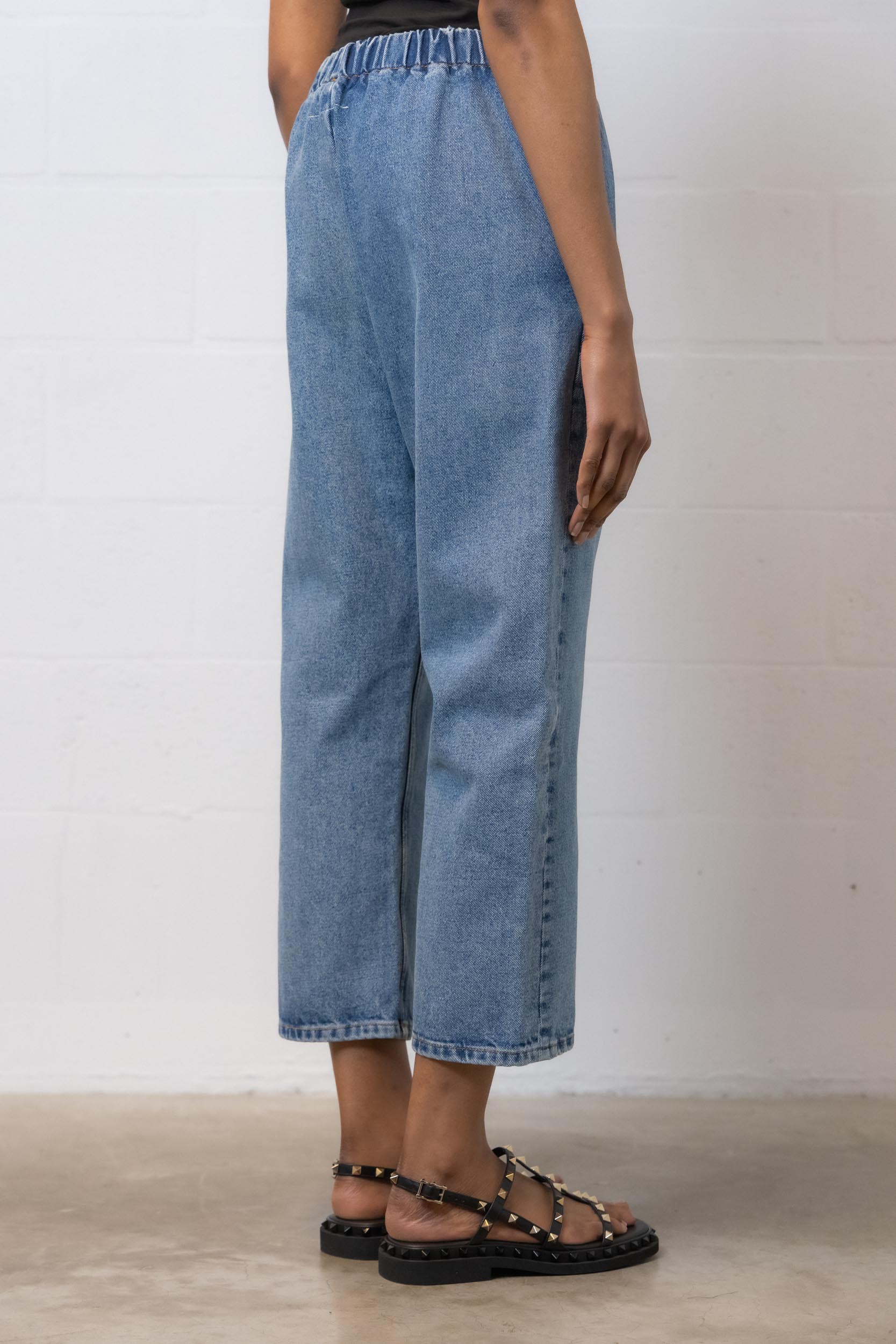 These blue cotton jeans are designed by MM6. It is made from a cotton blend and is equipped with side pockets. Sporting a straight cut with an elasticated waist, the back is decorated with a horizontal line of white stitching, a signature of the brand that is both discreet and elegant.