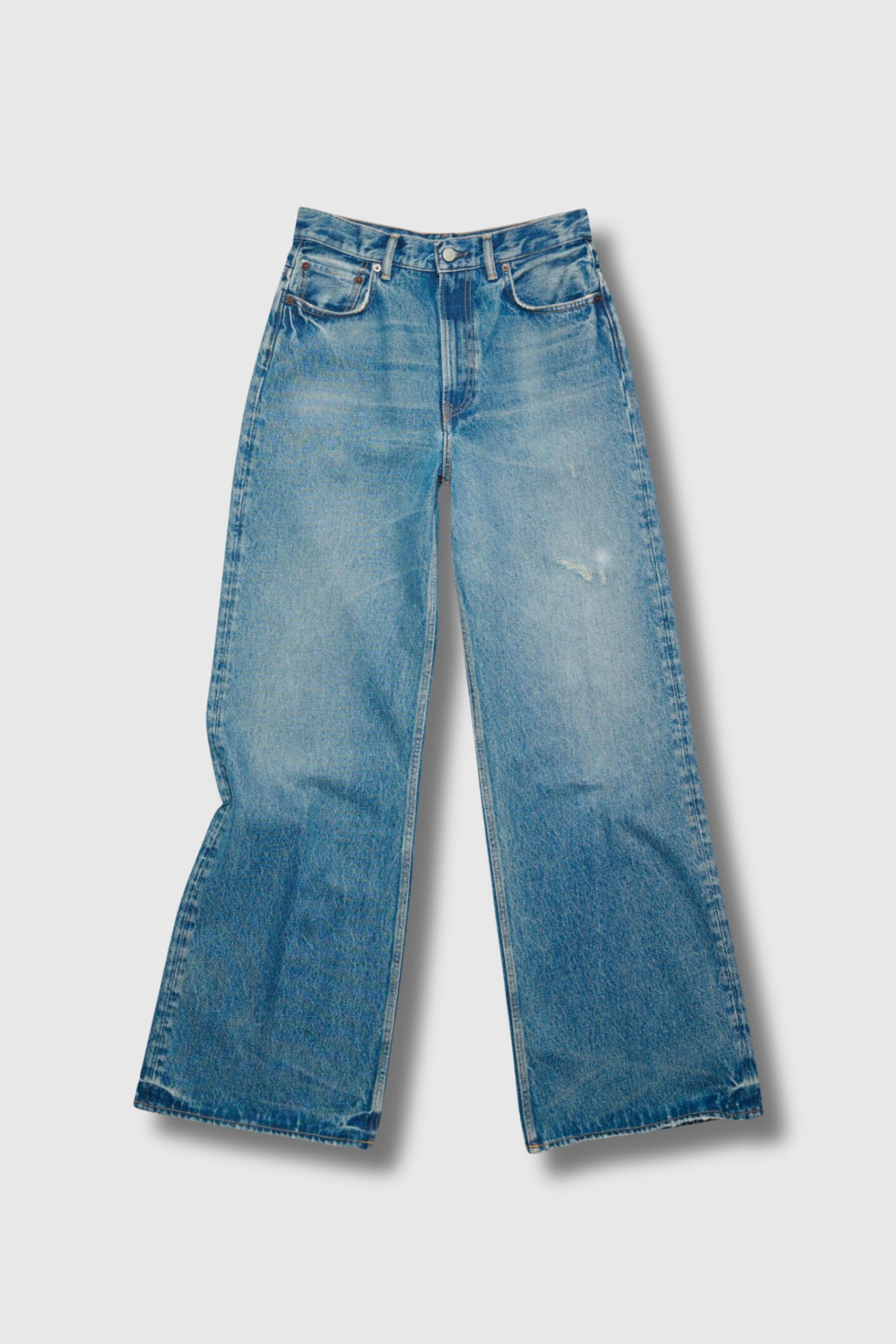 These blue jeans are made from 100% organic cotton by Acne Studios. They feature a loose fit and high waist, flattering the figure with wide legs and an elongated length. A contemporary and relaxed style, reflecting the sophisticated minimalism characteristic of the Swedish brand.