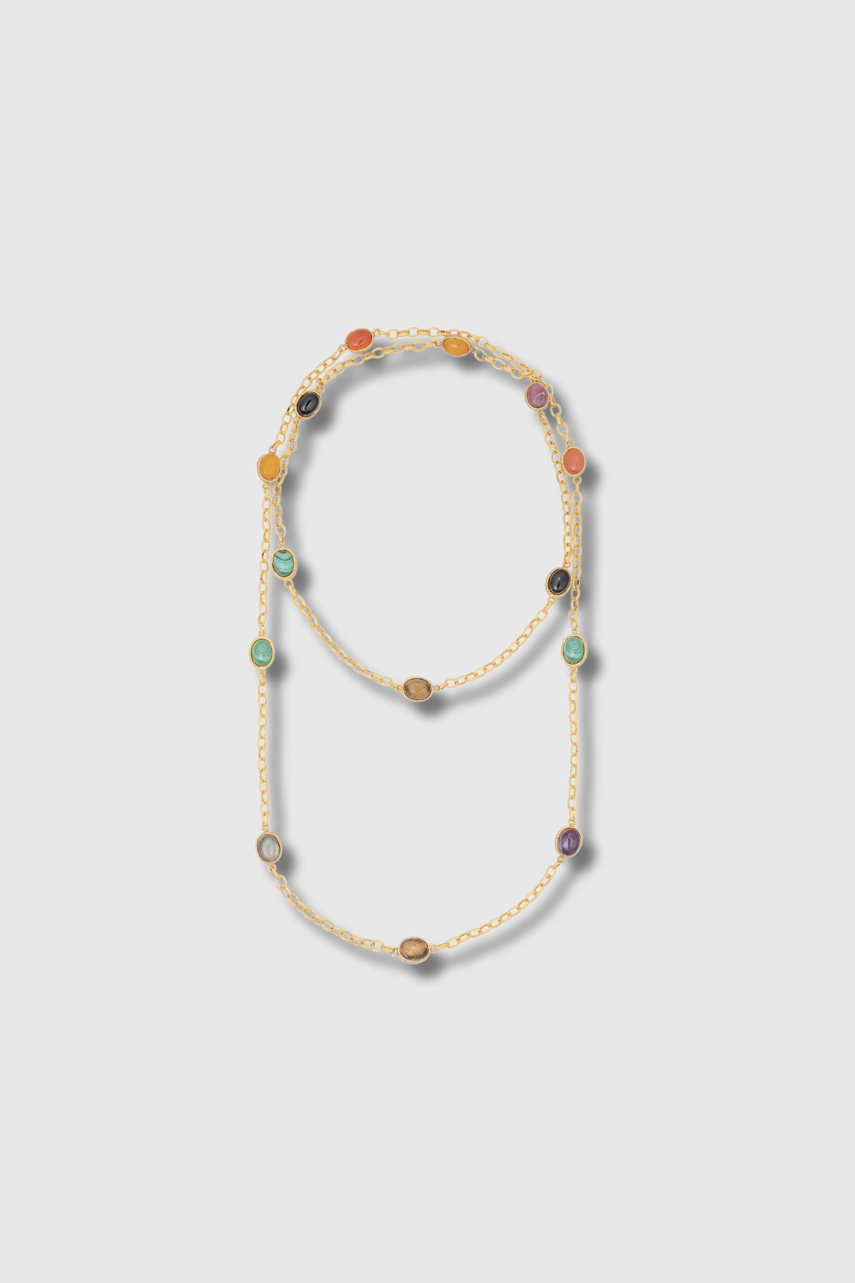 The “River” necklace by Sylvia Toledano fuses Parisian craftsmanship with the dynamic power of semi-precious stones. Crafted in 22 k gold-plated brass and adorned with lapis lazuli, tiger’s eye, malachite, amethyst, carnelian, labradorite and yellow onyx beads, this piece presents a refined multicolour palette. Its generous length offers fluid, statement wear—either layered or worn solo—designed to elevate contemporary looks with confident flair.