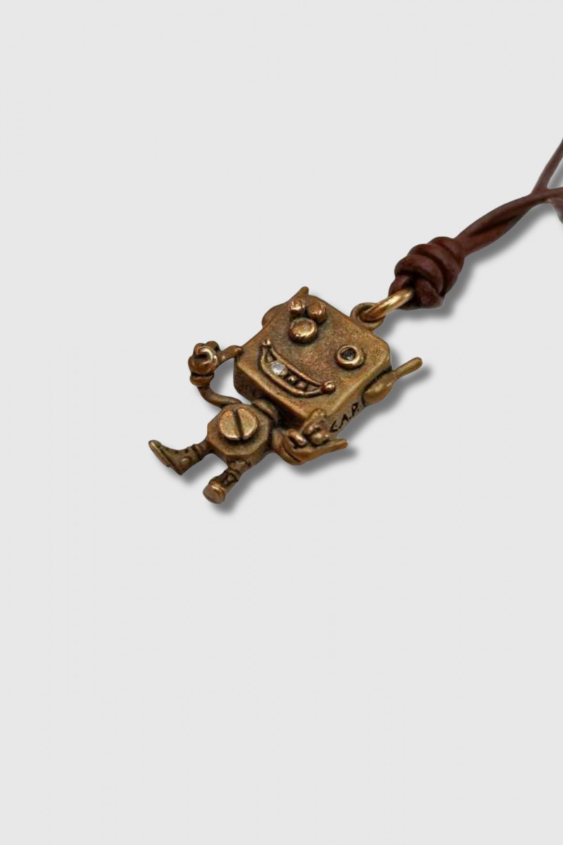 The “Robo Bro” pendant by Catherine Michiels stands out for its playful character and distinctive spirit. Crafted in bronze, it depicts a small expressive figure with finely worked details.