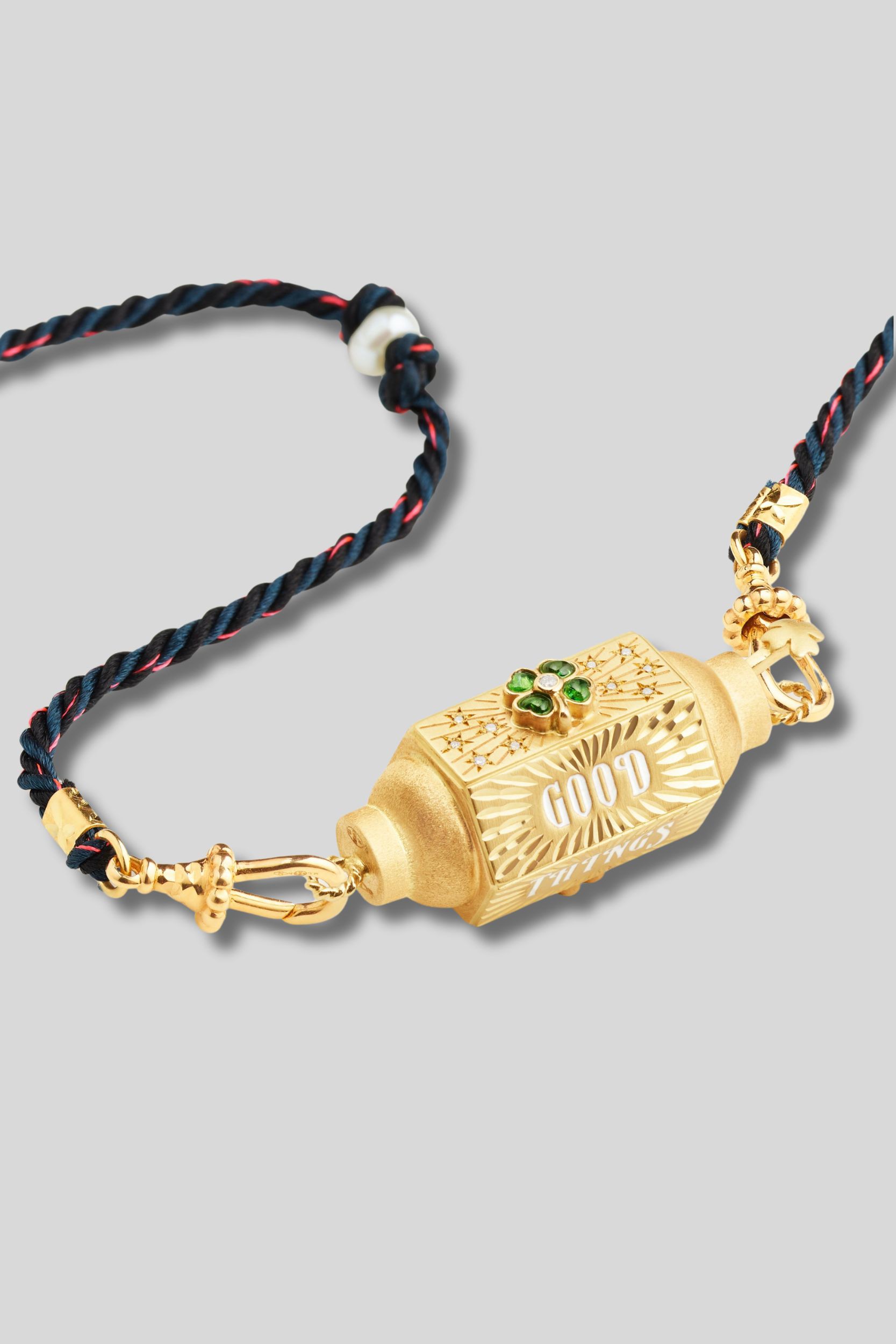 This 14-carat gold barrel is designed by Marie Lichtenberg. It is made of finely chiselled gold and set with two green onyx clovers in the center of which is a diamond. This barrel is decorated with the inscription "Good things are coming".