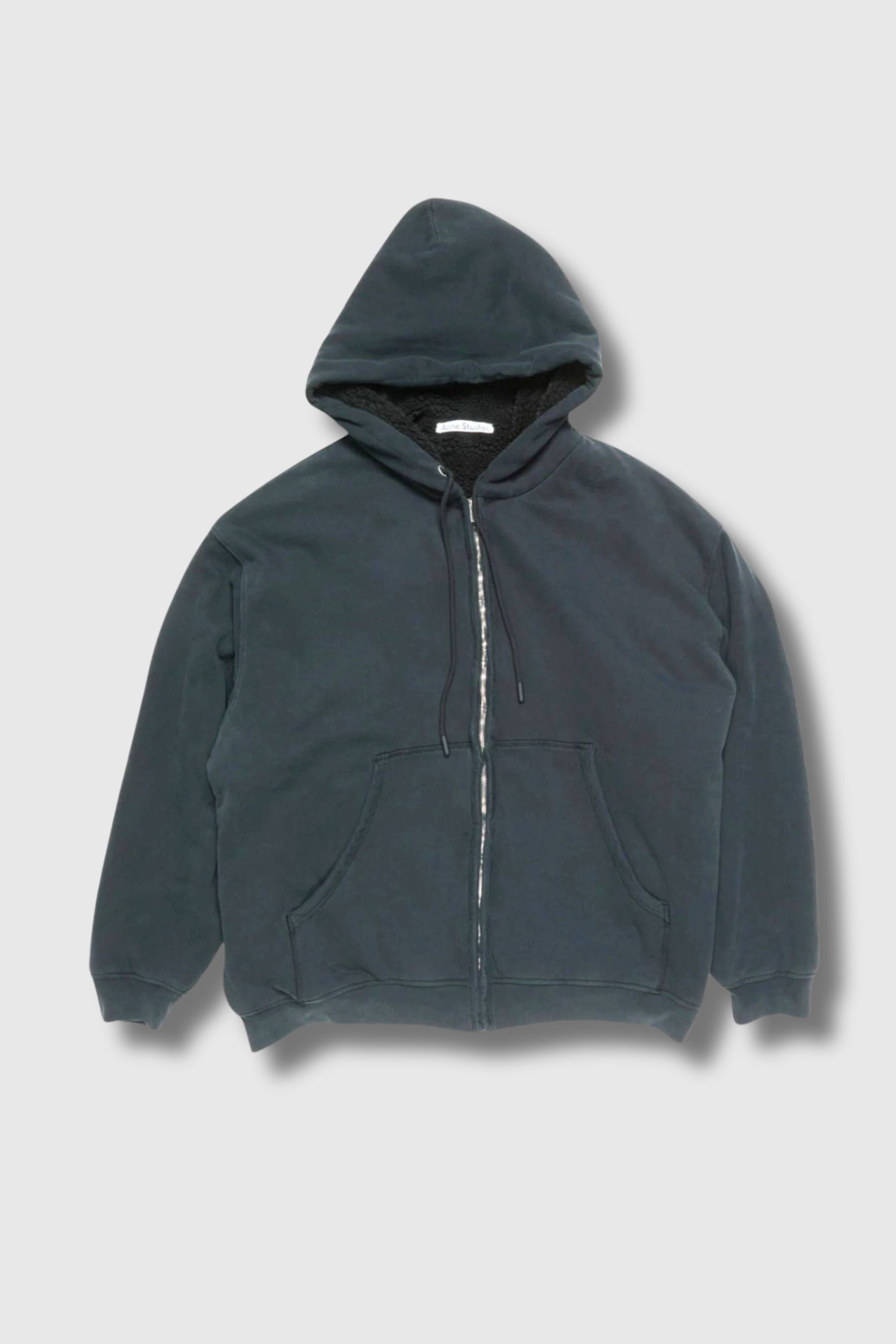 This black zip-up hoodie is designed by Acne Studios stands out with its vintage, worn-in look. Its relaxed fit and soft lining make it both stylish and comfortable.