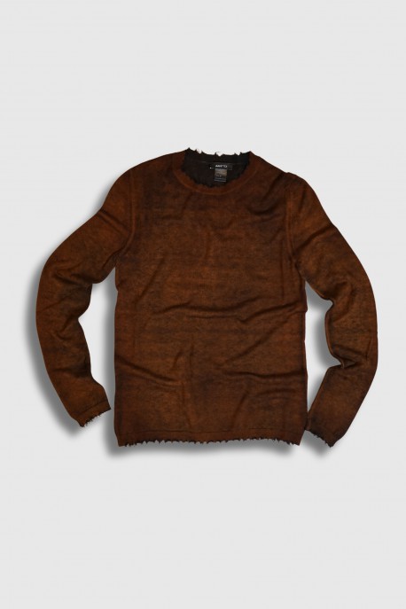 This cashmere and wool sweater by Avant Toi captivates with its rich, warm brown tones. Featuring a round neckline with frayed finishes, it blends refinement with a raw, authentic spirit. A piece of natural elegance, where earthy shades meet the brand’s contemporary signature.
