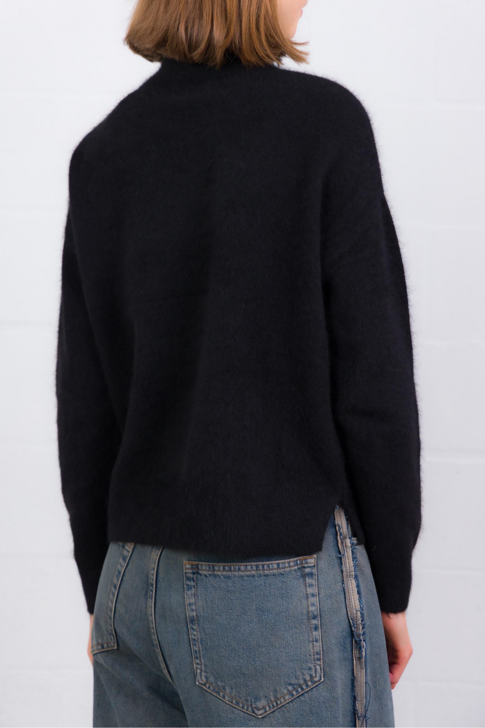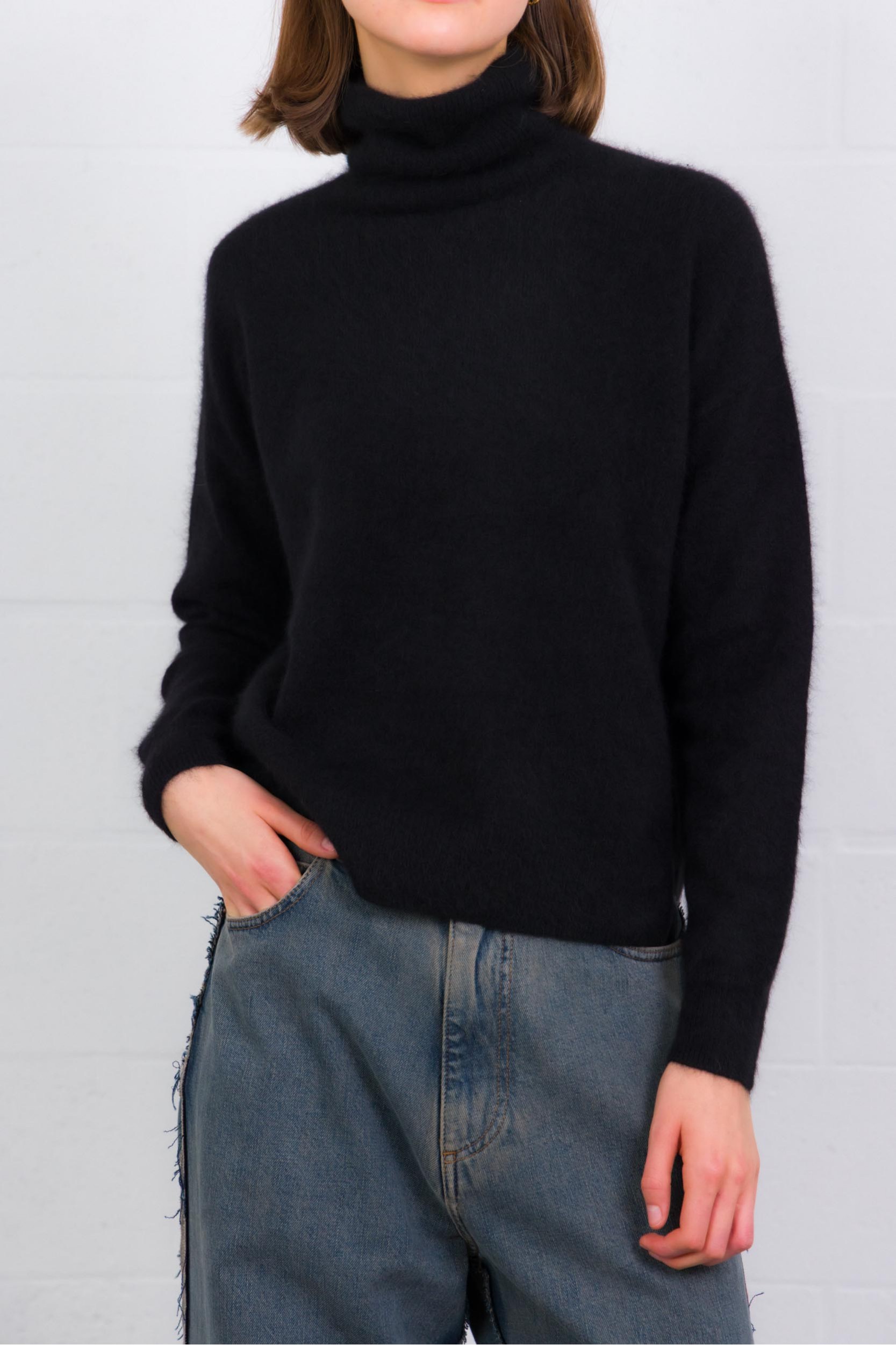 This black roll neck jumper is by Majestic Filatures. Made from raccoon wool blended with polyamide, it features a soft, airy knit known for its natural warmth and lightness. With long sleeves, it is ideal for creating comfortable, elegant outfits without weighing them down.