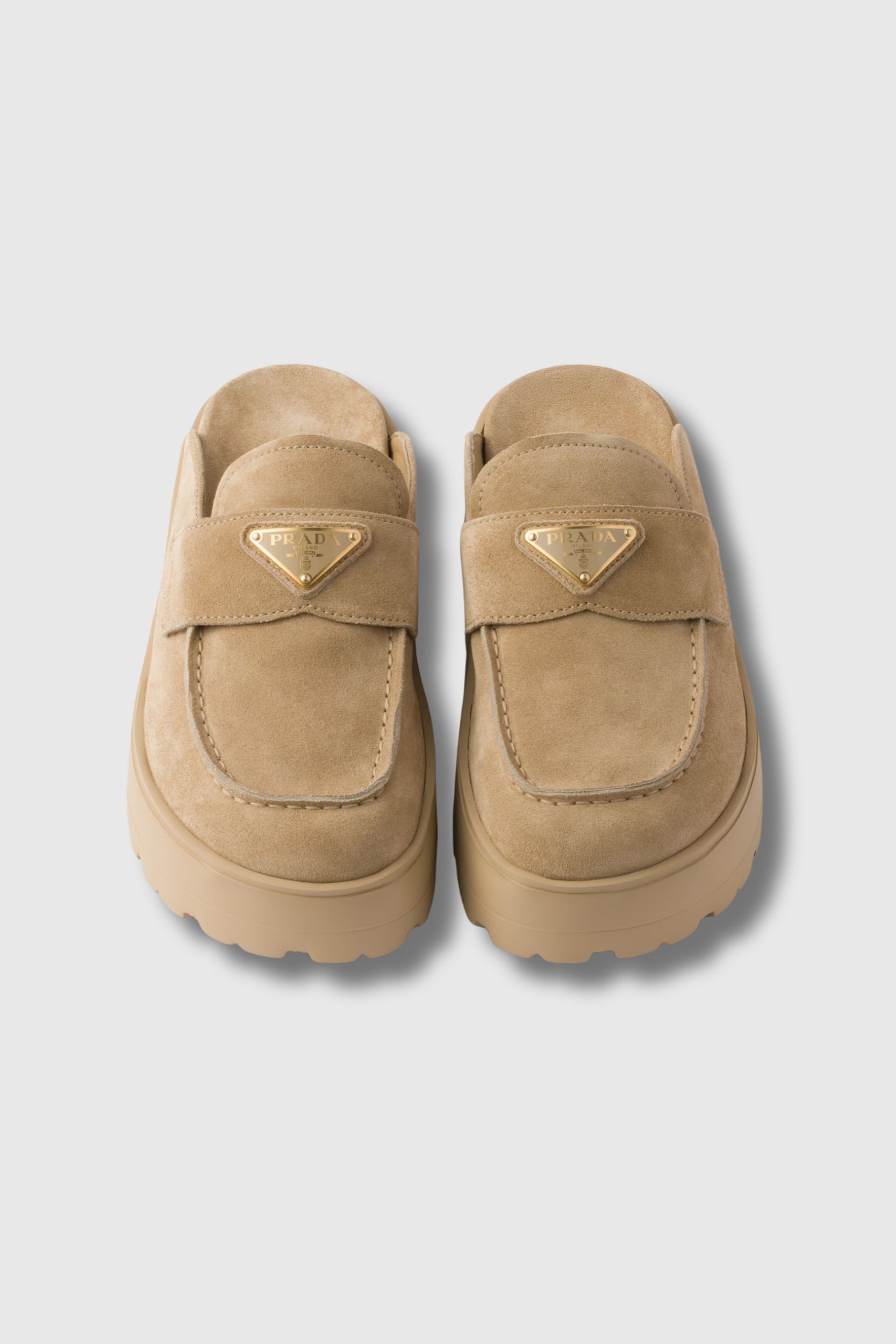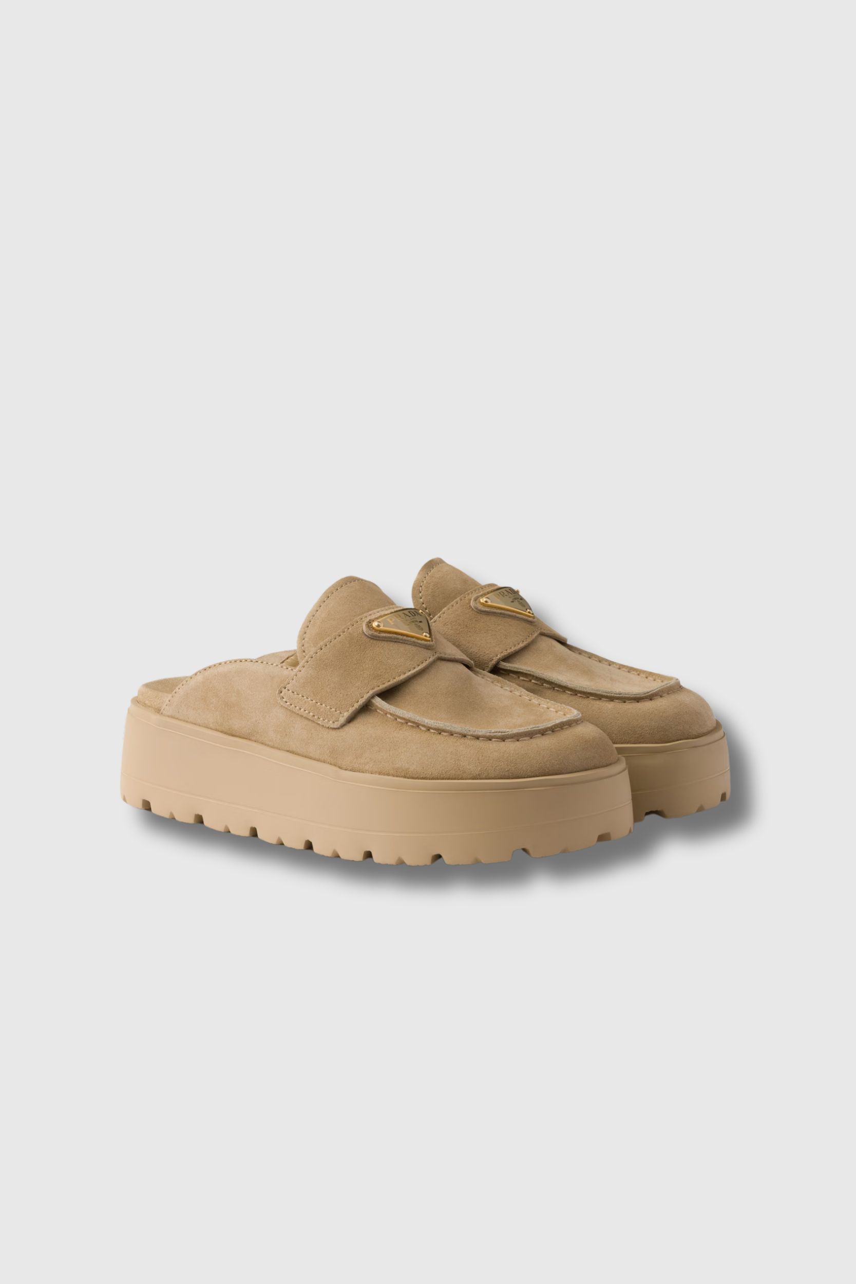 These flat platform mules in beige suede calfskin are designed by Prada. Crafted from soft suede calfskin, they combine artisanal craftsmanship with a modern, sporty look. The 4.5 cm lugged rubber platform sole contrasts elegantly with the classic upper adorned with a leather strap and enamelled metal triangle logo. A bold piece that is both comfortable and contemporary.