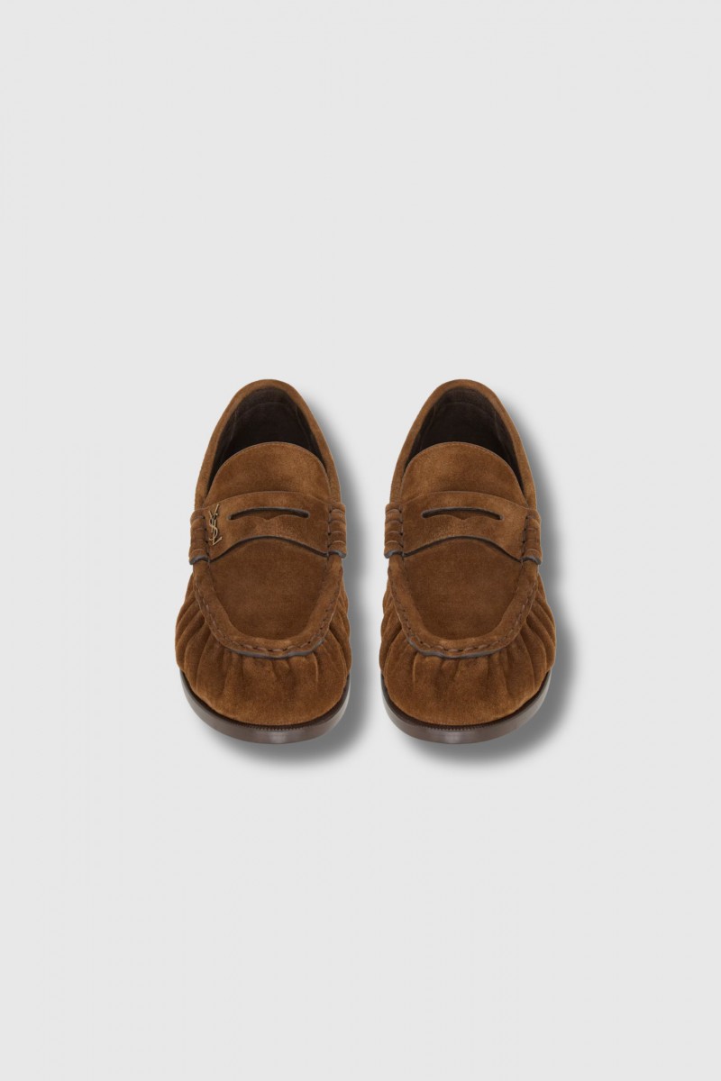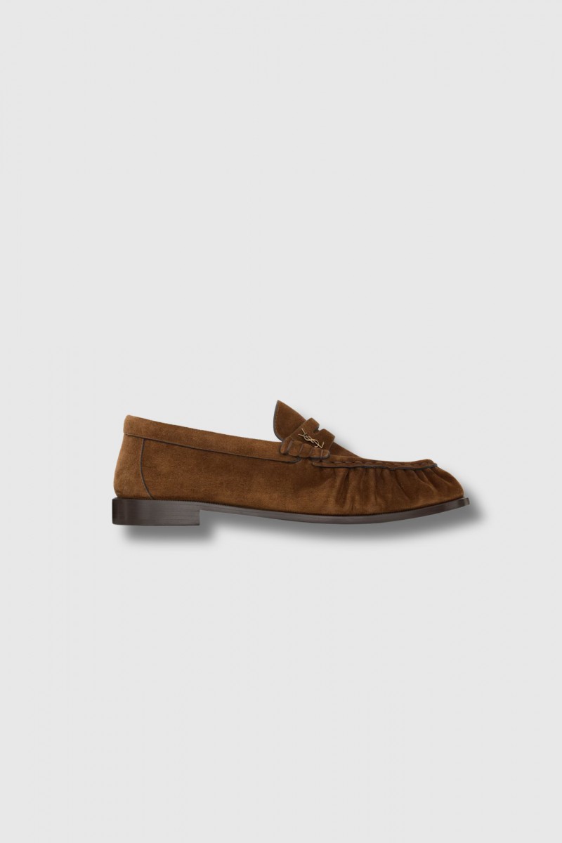 The soft brown suede loafers by Saint Laurent embody timeless natural elegance. These flexible loafers are enhanced by the iconic metal Cassandre signature and feature a hand-stitched moc-toe tip, reflecting exceptional craftsmanship. Finished with a leather sole, they offer the perfect balance of comfort, refinement, and minimalist sophistication.