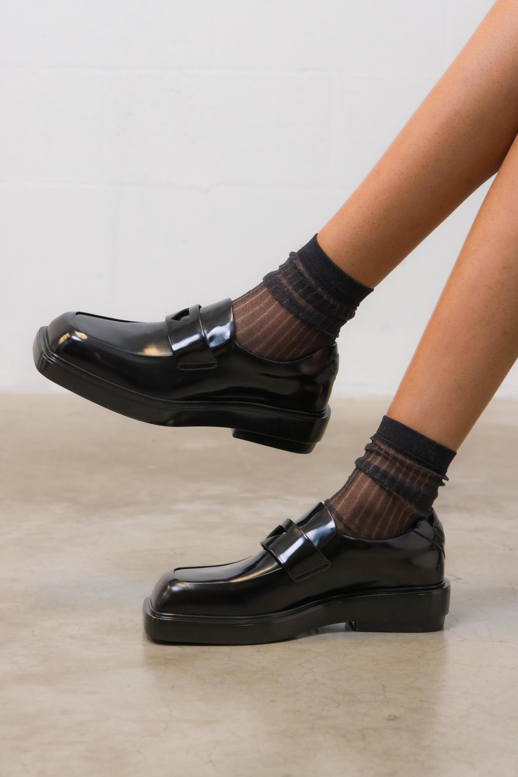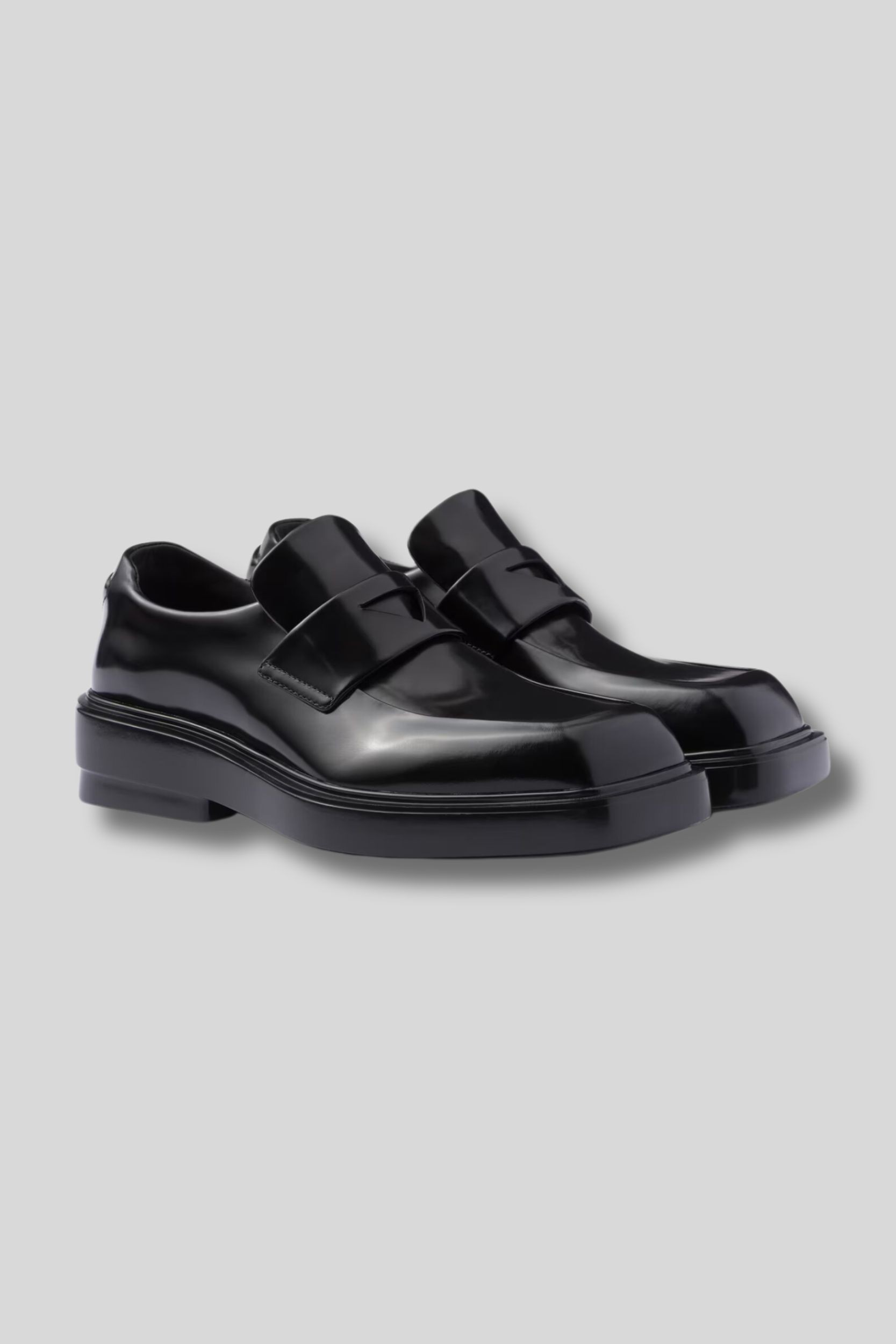 These black leather loafers are designed by Prada. They have a voluminous cut and are made of brushed leather.