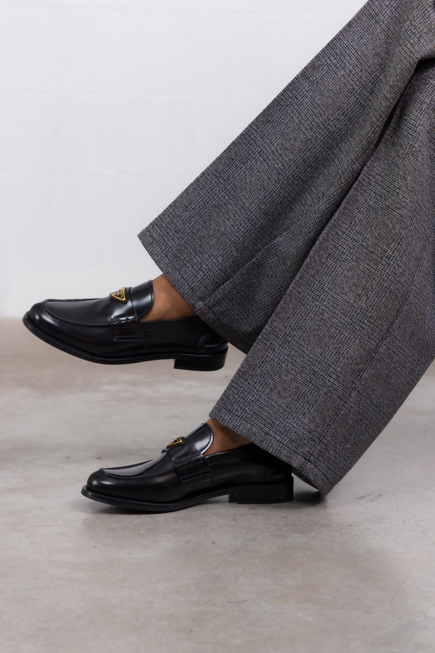 These black shiny smooth calf leather loafers are designed by Prada. They feature the house's triangular logo on the front.