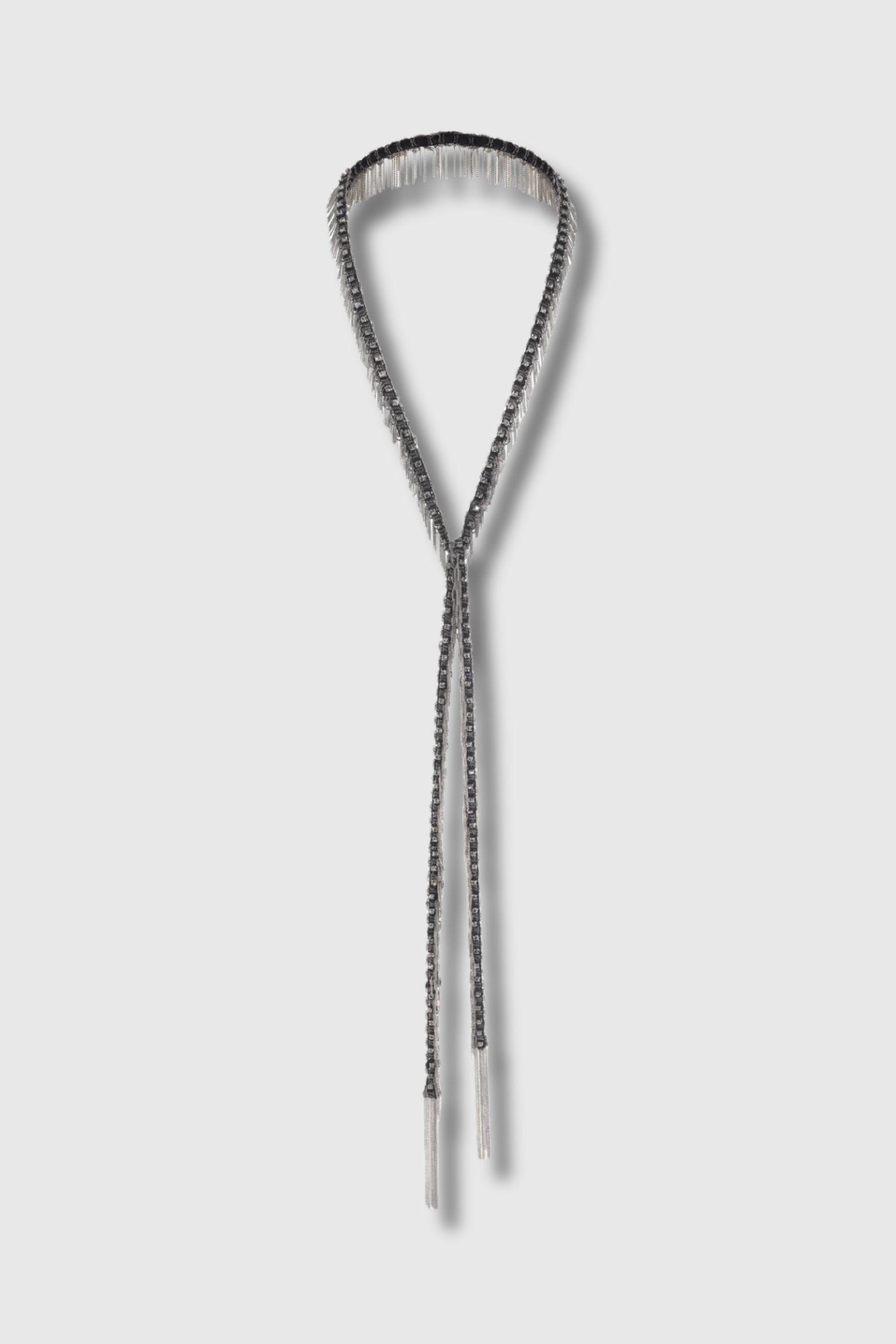 This long Cristal Noir necklace is designed by Marie Laure Chamorel. Crafted from ruthenium-finished brass, it stands out for its black fabric ribbon entirely embroidered with fine chains and crystal beads, highlighted with metallic fringes and finished with two chain tassels. A true couture jewel, it can be worn knotted, draped, or wrapped around the neck, showcasing the art of chain embroidery so dear to the designer.