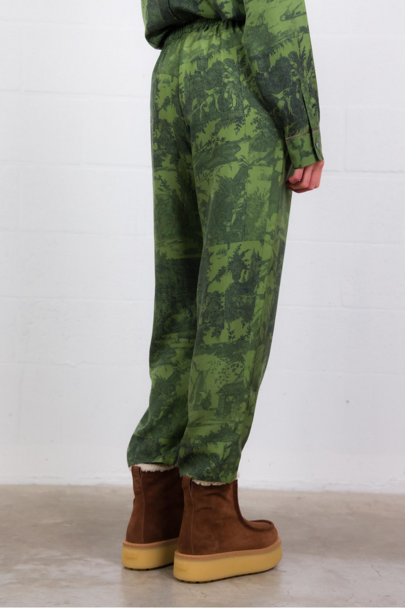 These green printed silk trousers are designed by Pierre-Louis Mascia. They feature an elasticated waistband with a drawstring, a straight cut and slanted pockets.
