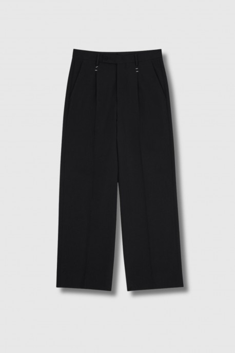 These black MM6 men's trousers boldly revisit the slim silhouette. Crafted from pressed wool, they feature hook fastenings at the waist, a nod to the brand's archives incorporated into the design. Belt loops, patch pockets and a piped pocket enhance their functional appeal, while the back features MM6's signature white topstitching, adding the perfect finishing touch to this elegant and contemporary design.