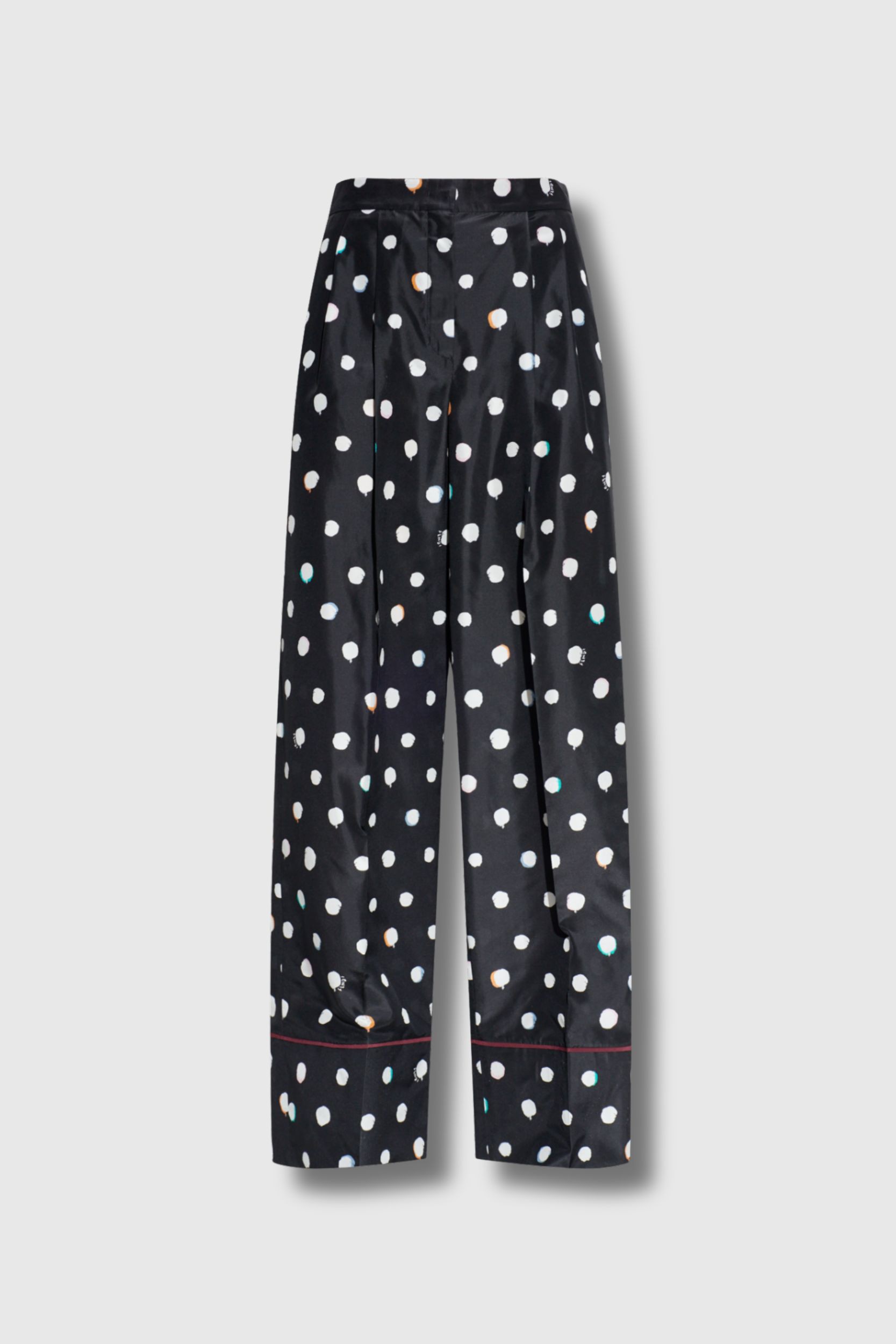 The black polka dot butterfly trousers by Fendi embody refined feminine elegance for everyday wear. Crafted from premium silk, they offer a subtle sheen, exceptional softness, and lightweight fluidity. The black base is enhanced with contrasting white polka dots and touches of pale blue and peach for a timeless yet original design. Featuring a high-waisted wide-leg cut with gentle pleats and side pockets, the look is completed by decorative red piping along the hem.