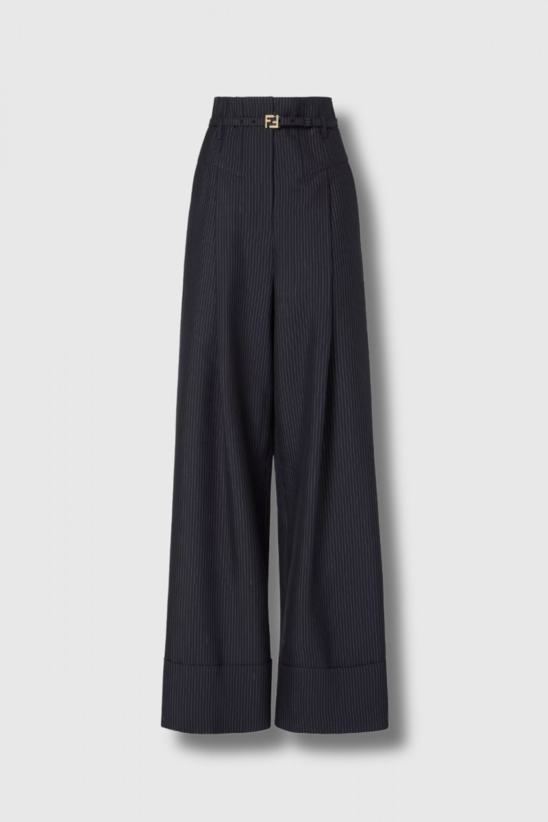 These navy blue belted trousers by Fendi combine elegant tailoring with signature details. Crafted from wool with fine black stripes, they feature a high waist with a basque and darts at the front, side pockets and wide turn-ups at the bottom for a refined style. The matching belt at the waist, embellished with an FF metal buckle, and the concealed zip fastening highlight the attention to detail. Palladium-finish metal trims add a contemporary touch to this chic and structured design.