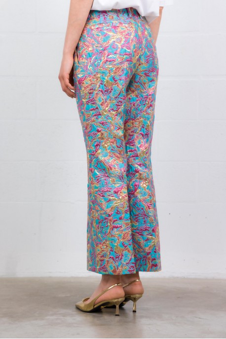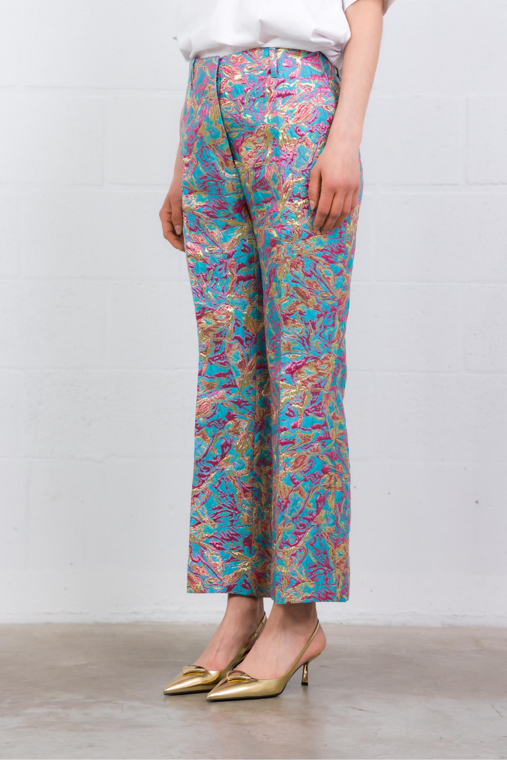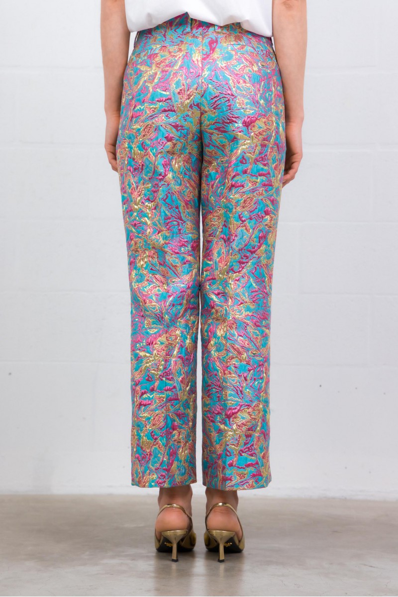 These Paloma brocade printed trousers are by Dries Van Noten. Crafted from lamé floral jacquard, they feature a straight, elegant fit. Designed with belt loops and pockets, they combine sophistication with a modern edge, perfect for a refined look.