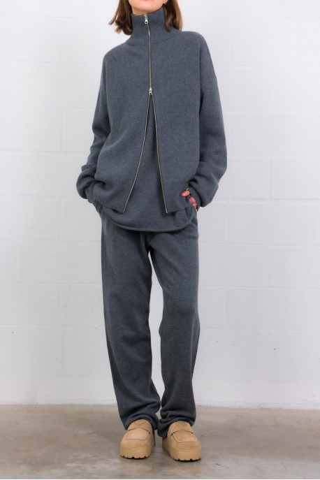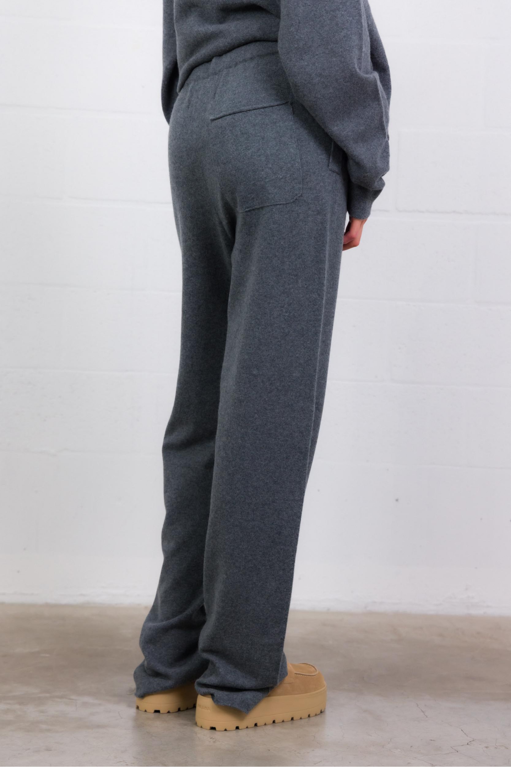 These Rush Felt stretch pants in gray cashmere are designed by Extreme Cashmere. Comfortable and refined, they feature an elasticated waistband with drawstring, side pockets, and a back pocket. Their unique feature is their raw-edge hem, which allows for easy length adjustment: they can be cut with fabric scissors for a tailored fit.