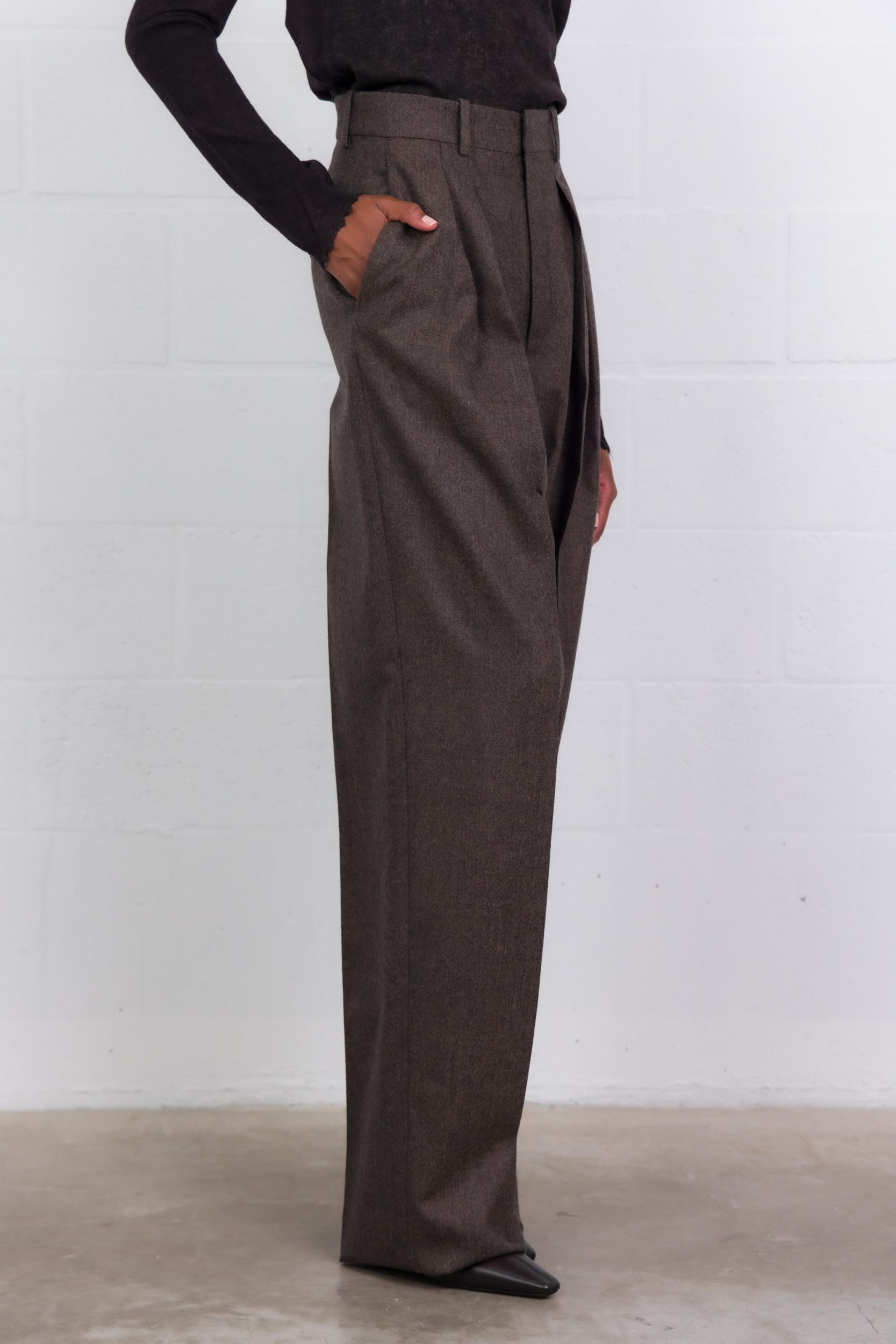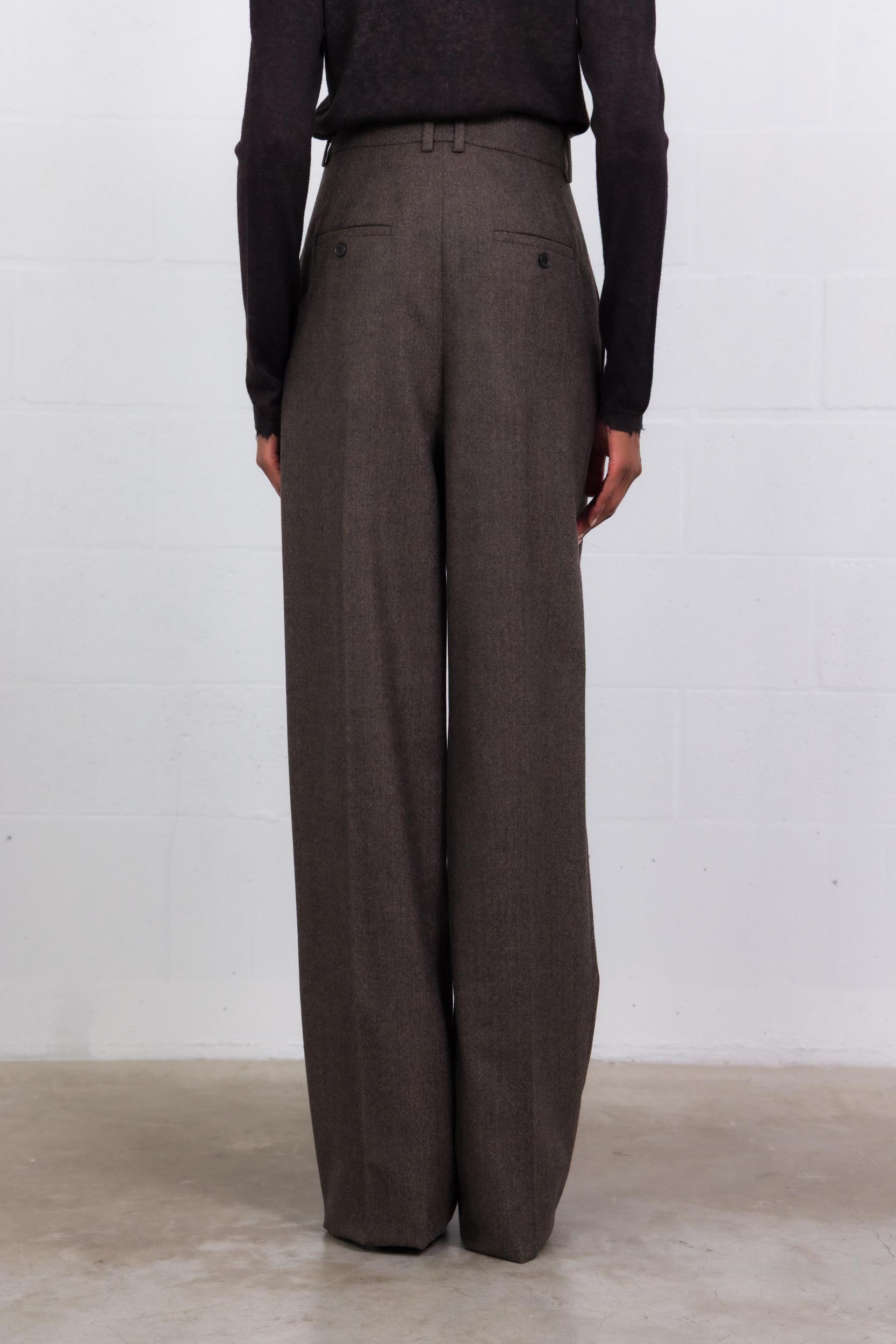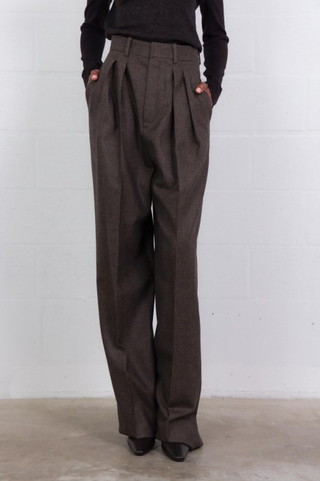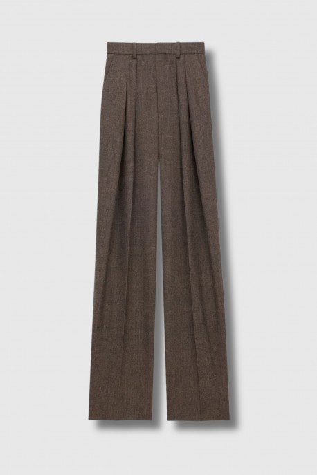 These blurred herringbone trousers are designed by Saint Laurent. They feature a double pleat, a centre pleat, two front slanted pockets and two back welt pockets. The trousers have a loose fit and are worn mid-rise.