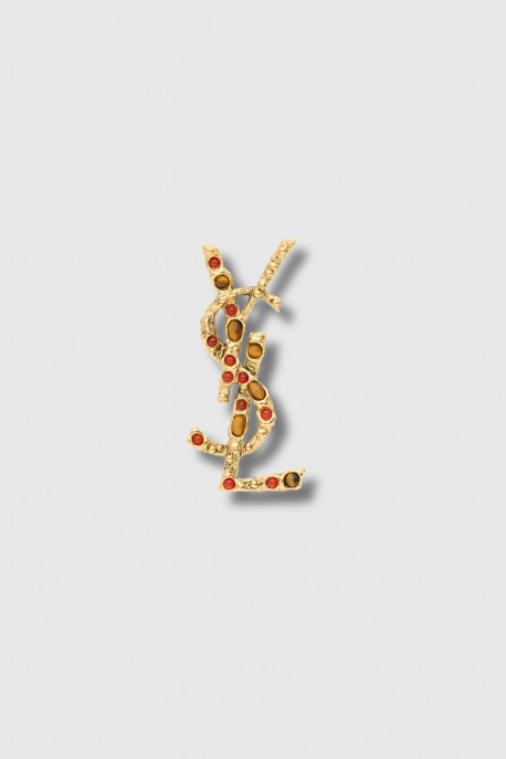 This Cassandre brooch in tiger's eye, sunstone and gold-tone metal by Saint Laurent embodies precious elegance with a bold character. Adorned with warm, luminous stones, it highlights the iconic Cassandre signature. Featuring a pin clasp with a hook and Saint Laurent engraving, it can be worn on a jacket lapel or as an accessory for a sophisticated and distinctive touch.