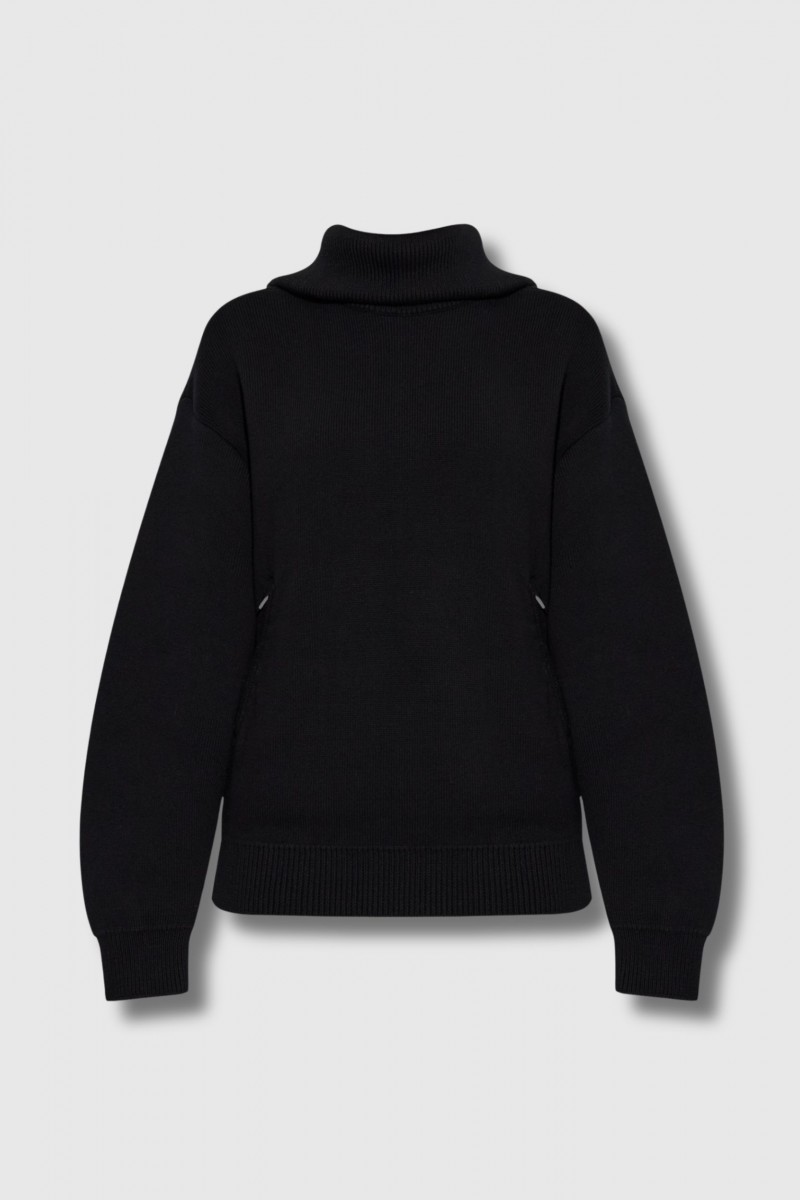 This black cotton Back to Front sweater is designed by Balenciaga. Inspired by the brand's couture heritage, it stands out with its slightly oversized roll neck cut, offering comfort and elegance. Crafted from fine-textured cotton knit, it features elongated sleeves and wide ribbed cuffs for a structured silhouette. A discreet zip at the back of the collar and two side pockets with metal zips add a functional and refined touch. The logo-engraved fastenings are a testament to Balenciaga's iconic craftsmanship.