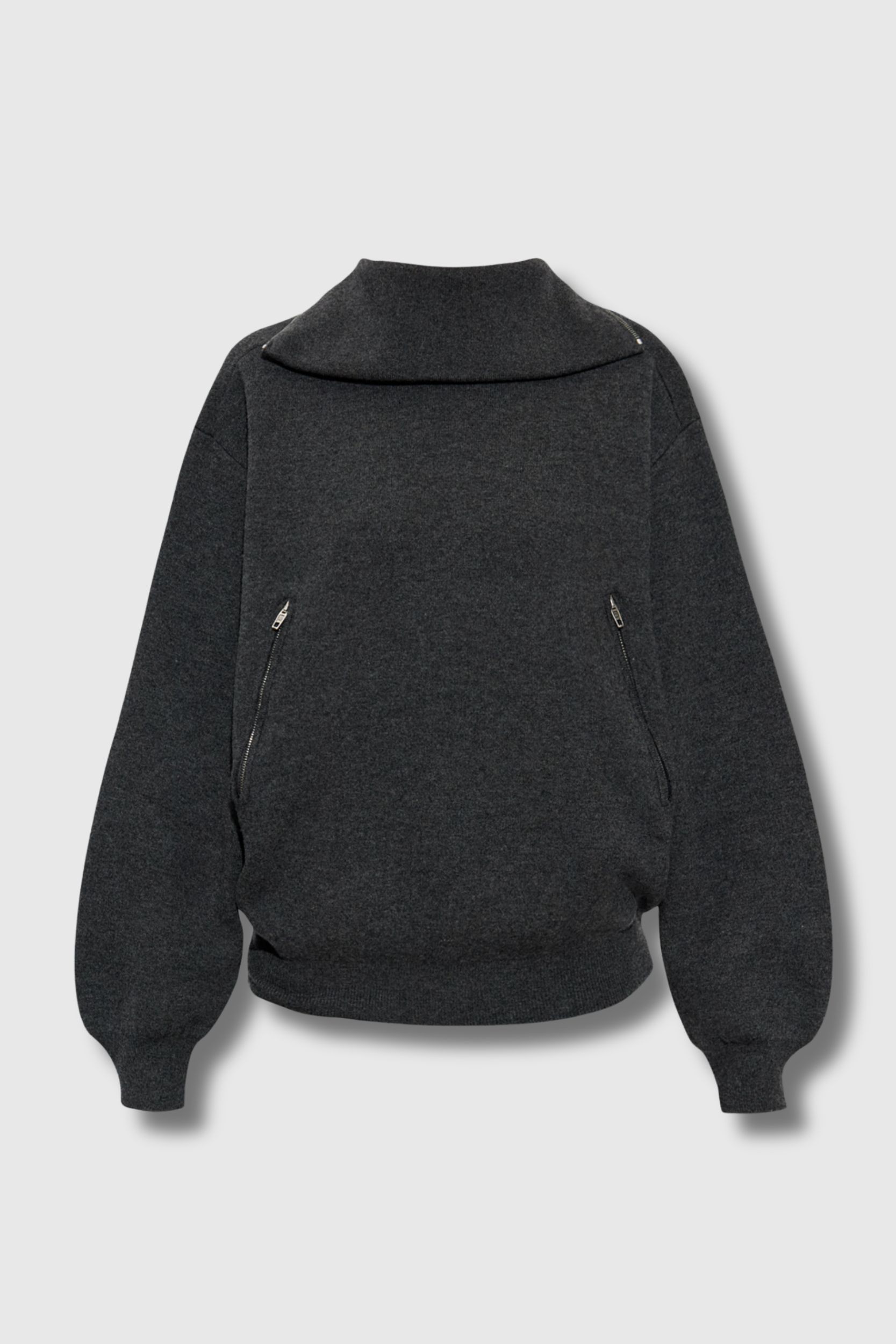 This gray wool Back to Front sweater is designed by Balenciaga. Inspired by the brand's couture heritage, it stands out with its slightly oversized roll neck cut, offering comfort and elegance. Crafted from fine-textured cotton knit, it features elongated sleeves and wide ribbed cuffs for a structured silhouette. A discreet zip at the back of the collar and two side pockets with metal zips add a functional and refined touch. The logo-engraved fastenings are a testament to Balenciaga's iconic craftsmanship.