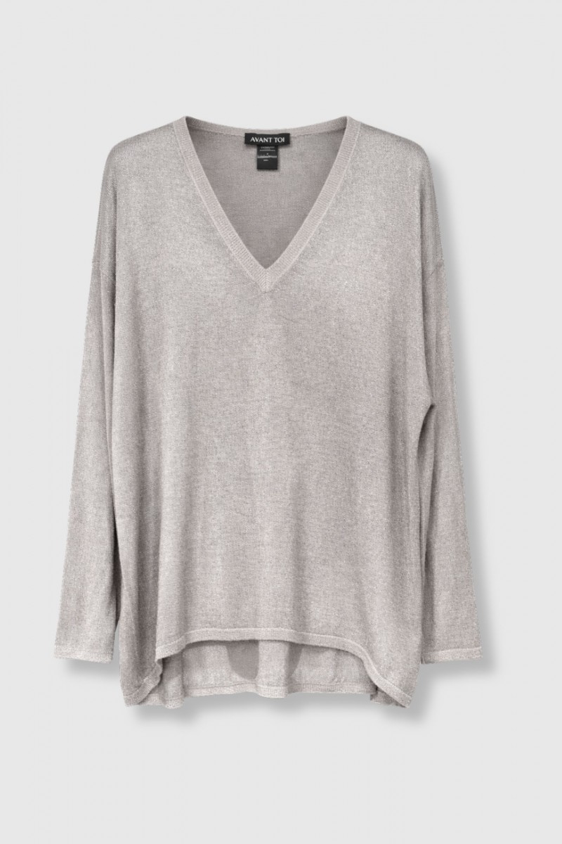 This pale pink silk and cashmere laminated jumper by Avant Toi elegantly combines luxury and comfort. Its delicate, slightly shiny texture creates a subtle luminous effect, while the plunging V-neck emphasises the femininity of the silhouette. The long sleeves and loose fit ensure ease and comfort, making this jumper a sophisticated and versatile piece, ideal for wearing on its own or layered for a refined and contemporary look.