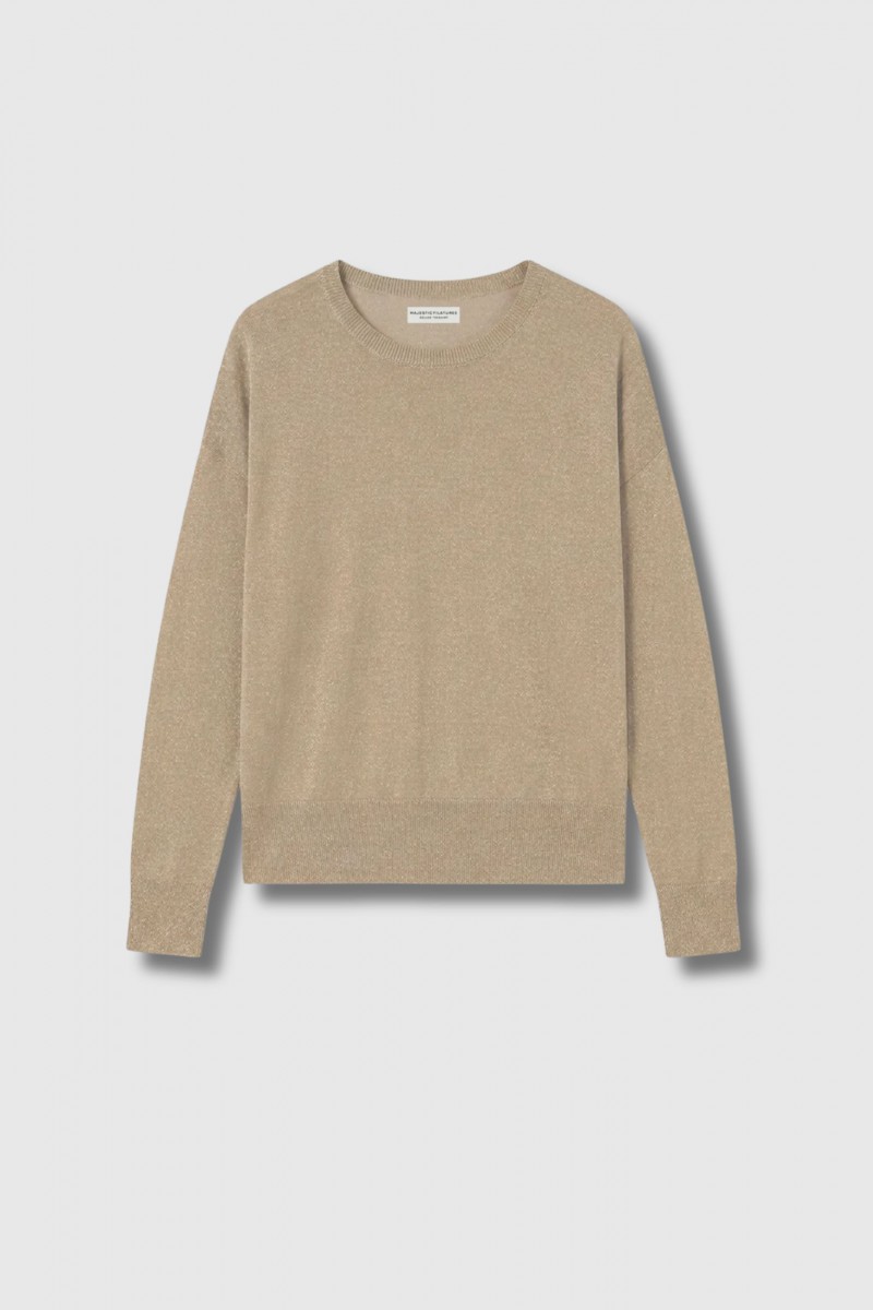 This gold metallic lightweight sweater is by Majestic Filatures. With its soft, fluid drape, it adds a subtle shimmering touch for a chic and refined style. Elegant and versatile, it enhances the silhouette effortlessly.
