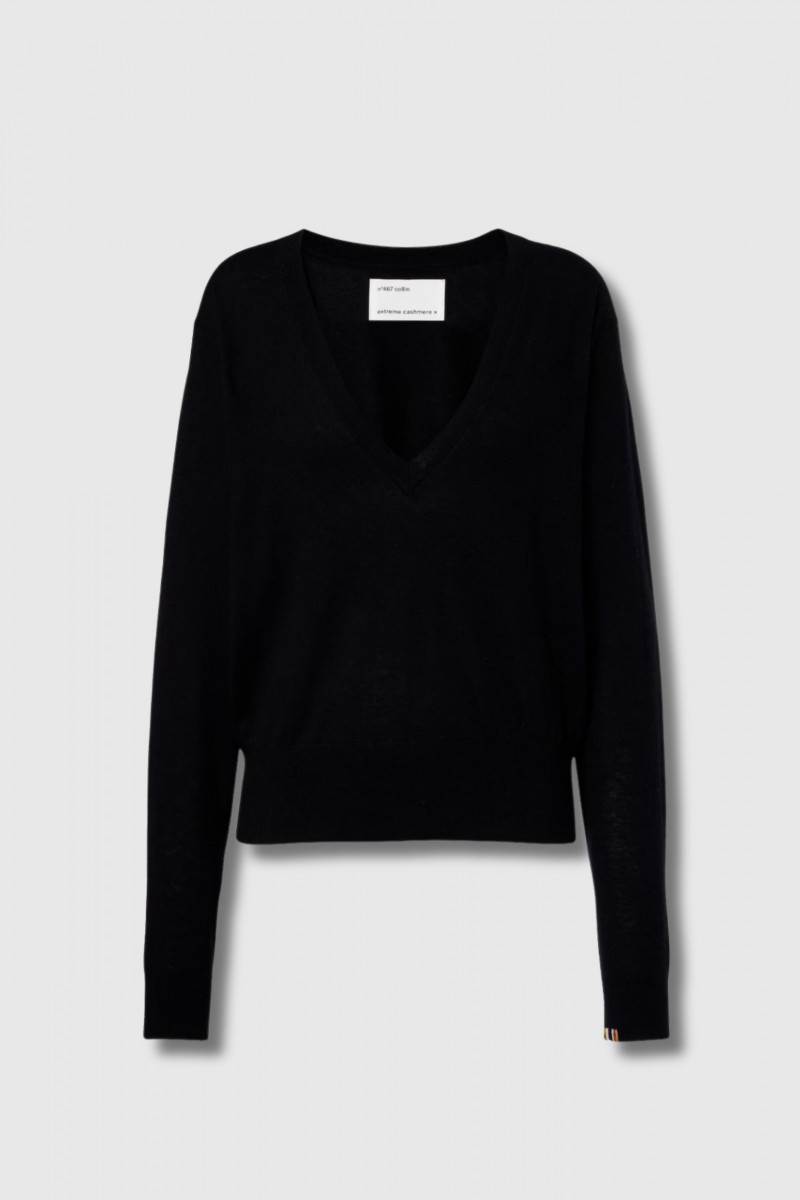 This Collin V-neck sweater in black cashmere and wool is by Extreme Cashmere. Crafted from a soft blend of wool and cashmere, it features a relaxed fit with an elegant V-neckline. Subtle ribbed trims complete this comfortable and timeless design.