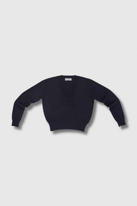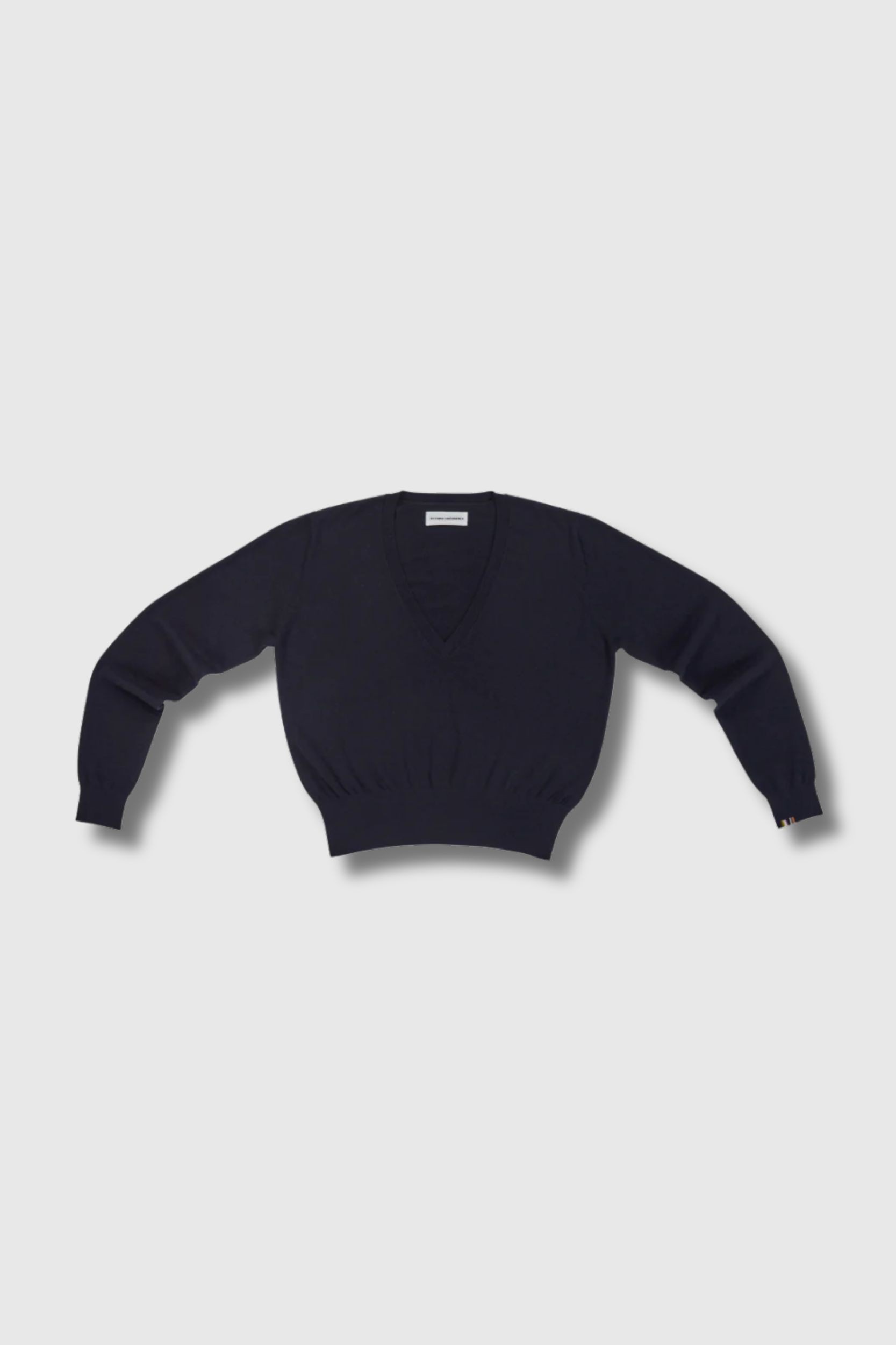 This Collin V-neck sweater in navy cashmere and wool is by Extreme Cashmere. Crafted from a soft blend of wool and cashmere, it features a relaxed fit with an elegant V-neckline. Subtle ribbed trims complete this comfortable and timeless design.
