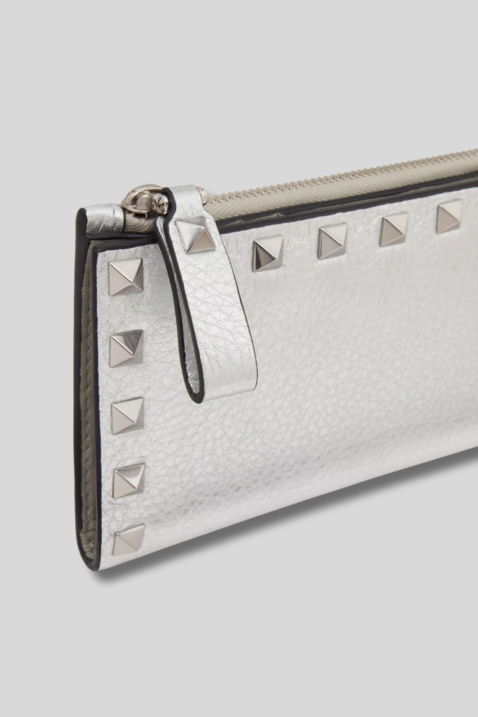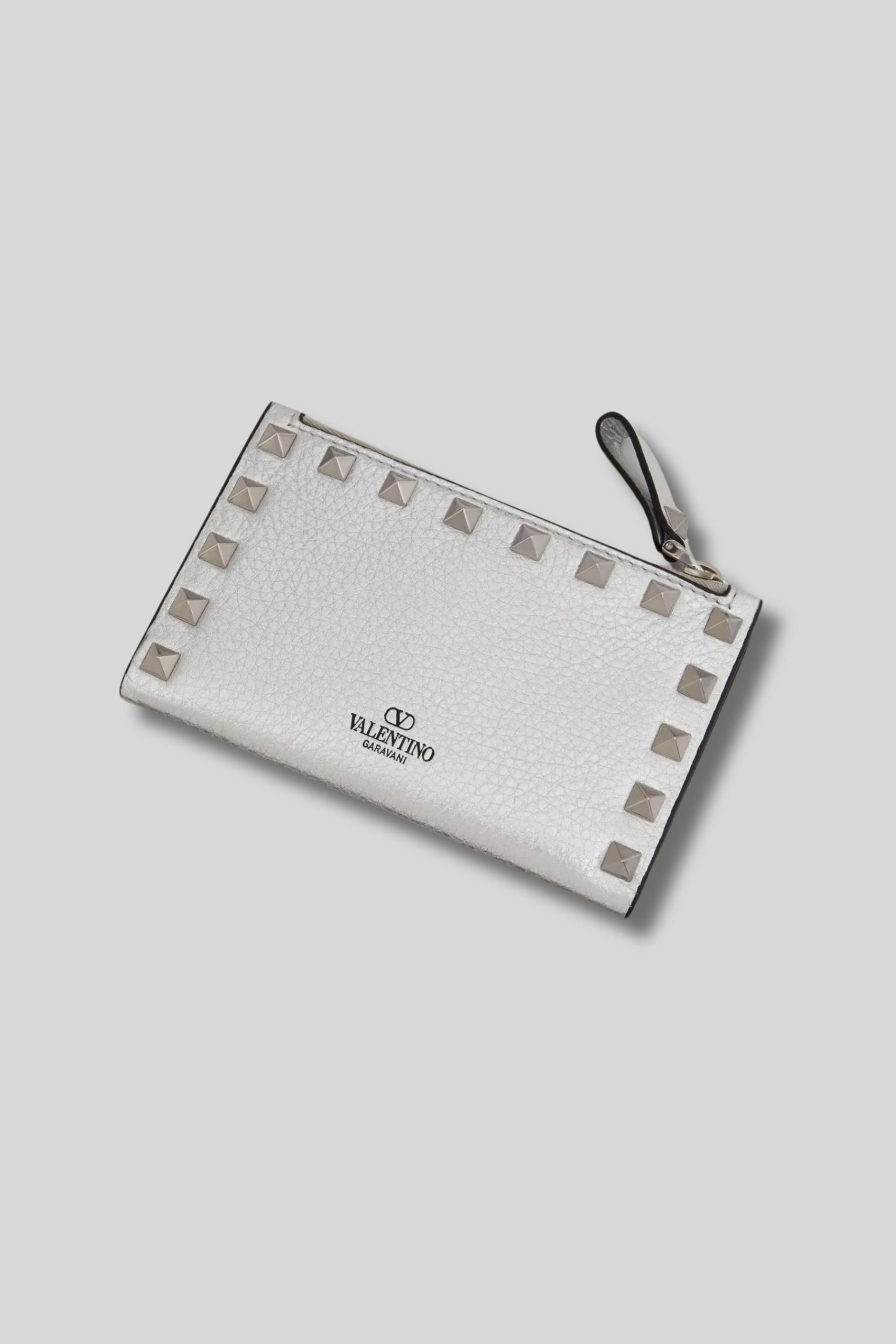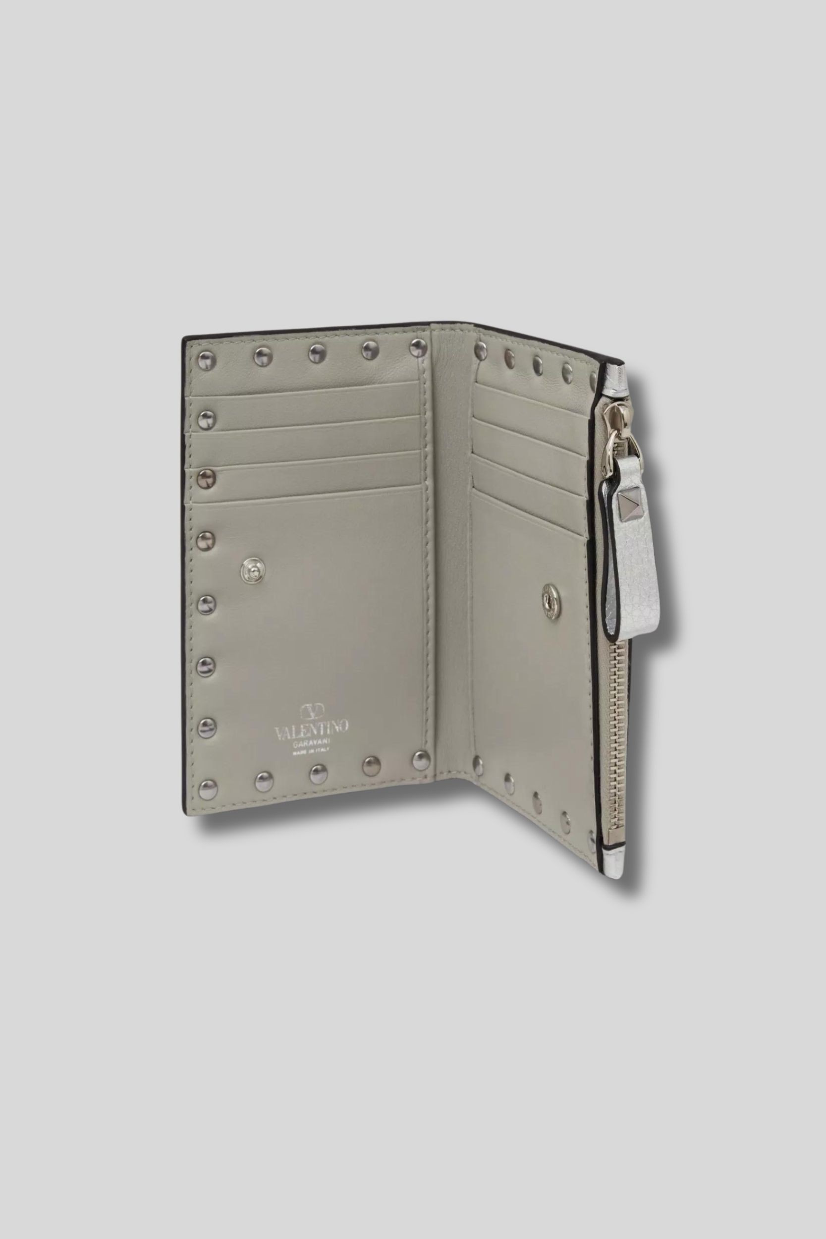 This metallic calfskin card holder is designed by Valentino Garavani. It is made from grained leather and features small silver Rockstuds. Snap button closure and zip closure for the coin compartment.