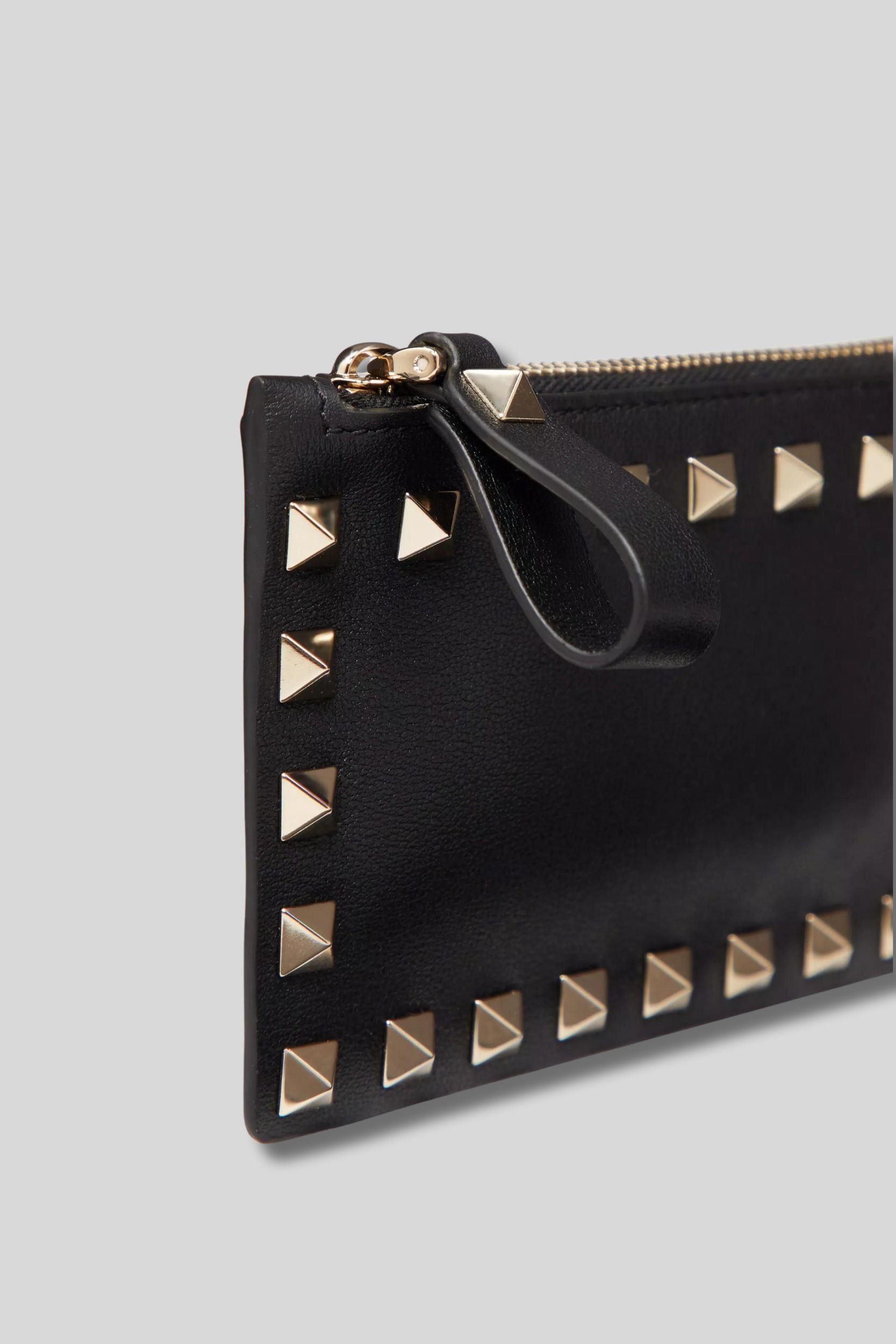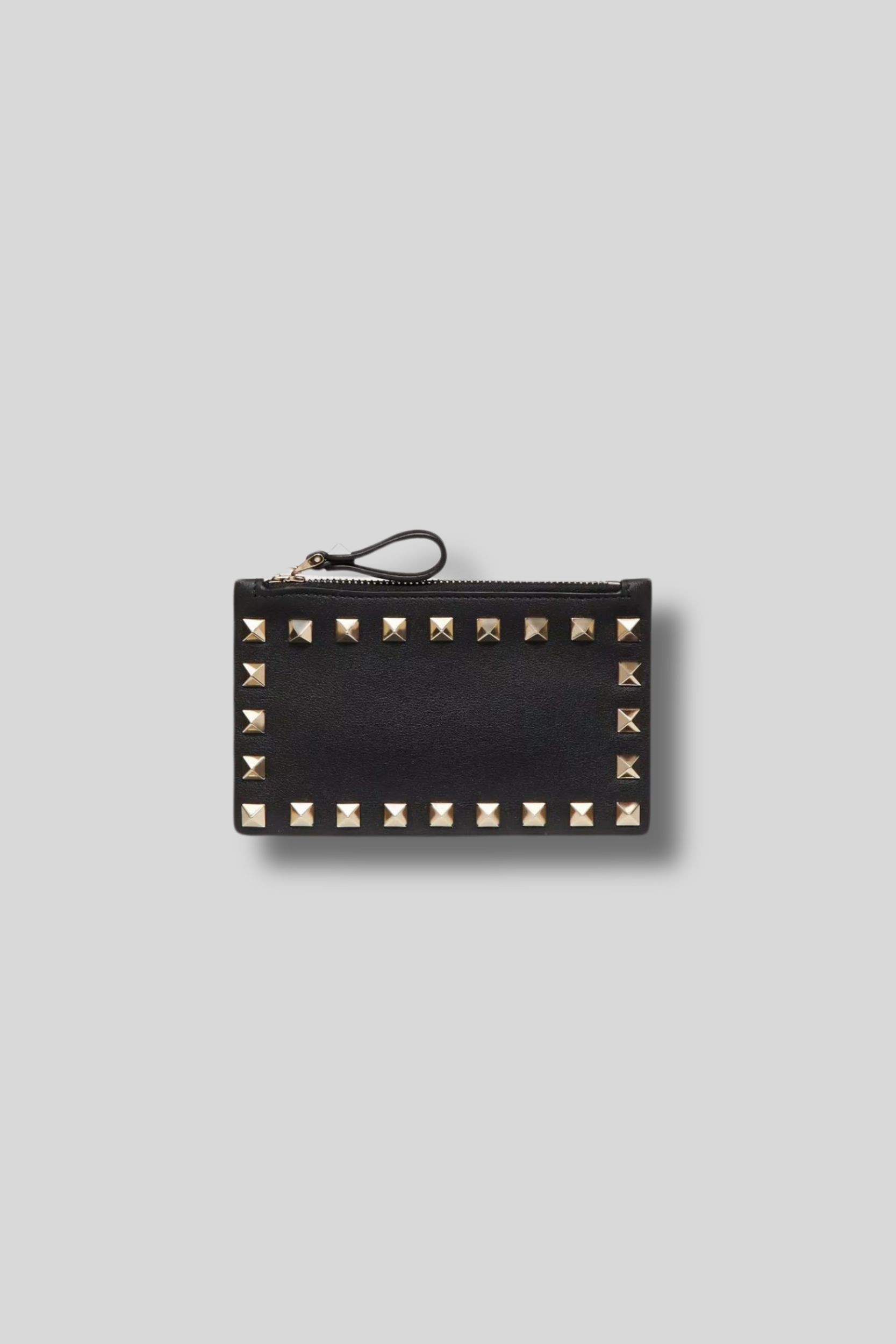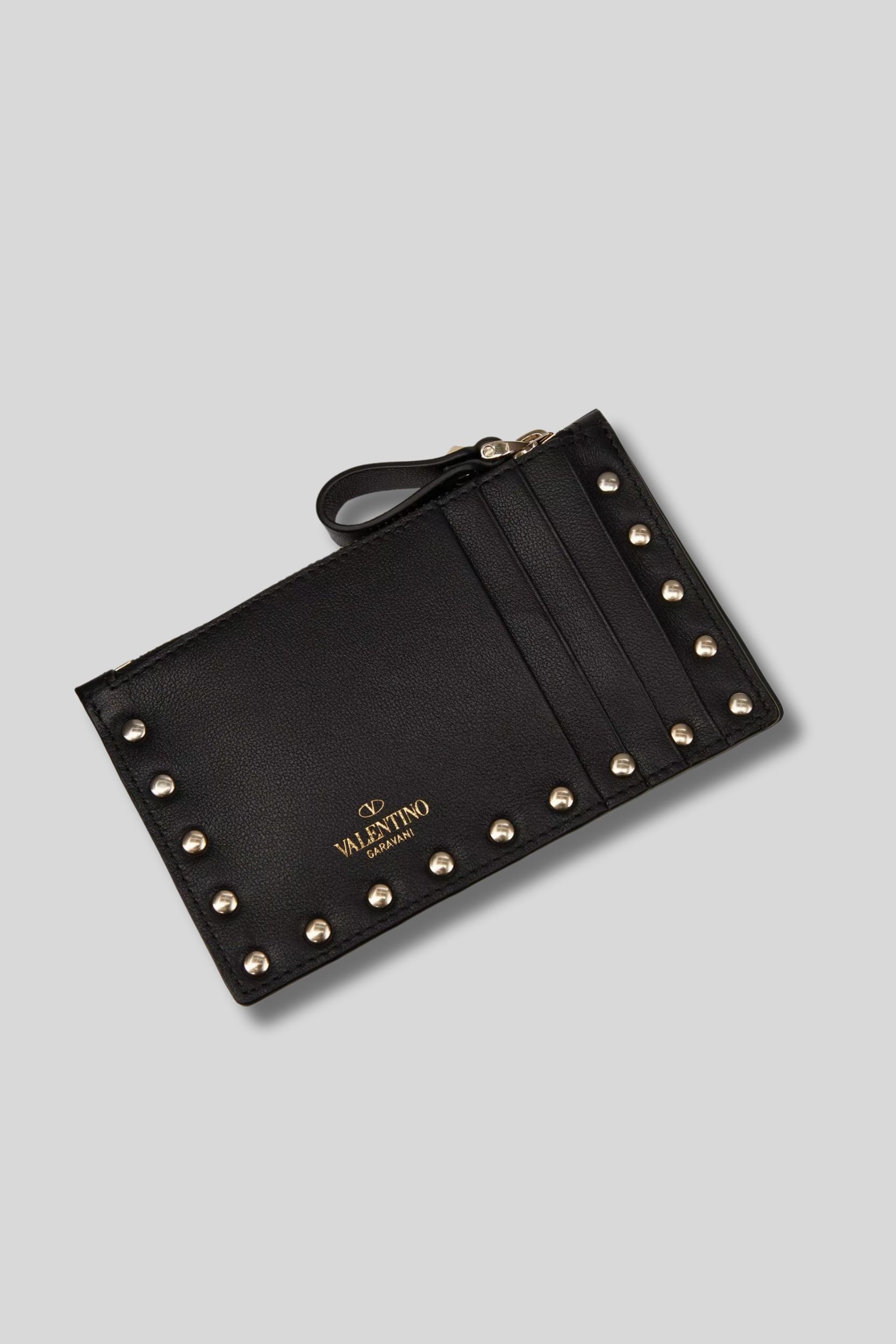 This smooth black calf leather Rockstud wallet and cardholder is designed by Valentino Garavani. It features platinum-finish Rockstud studs, a zipped coin compartment, and four card slots.
