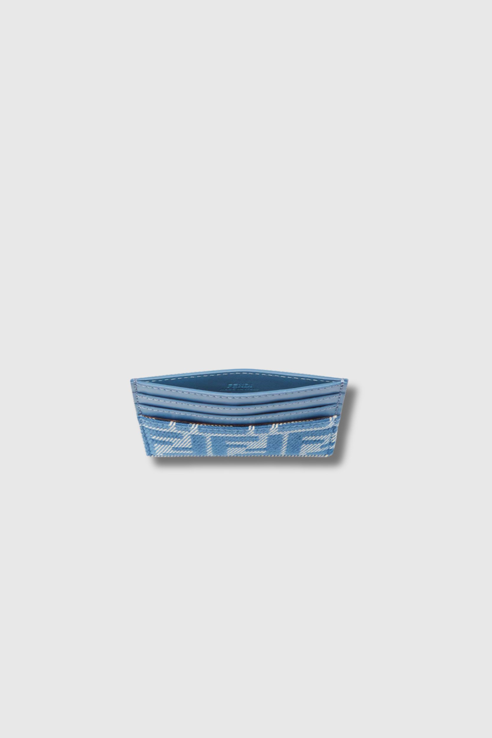 This denim blue FF cardholder is designed by Fendi. It has 6 slots and a central compartment.