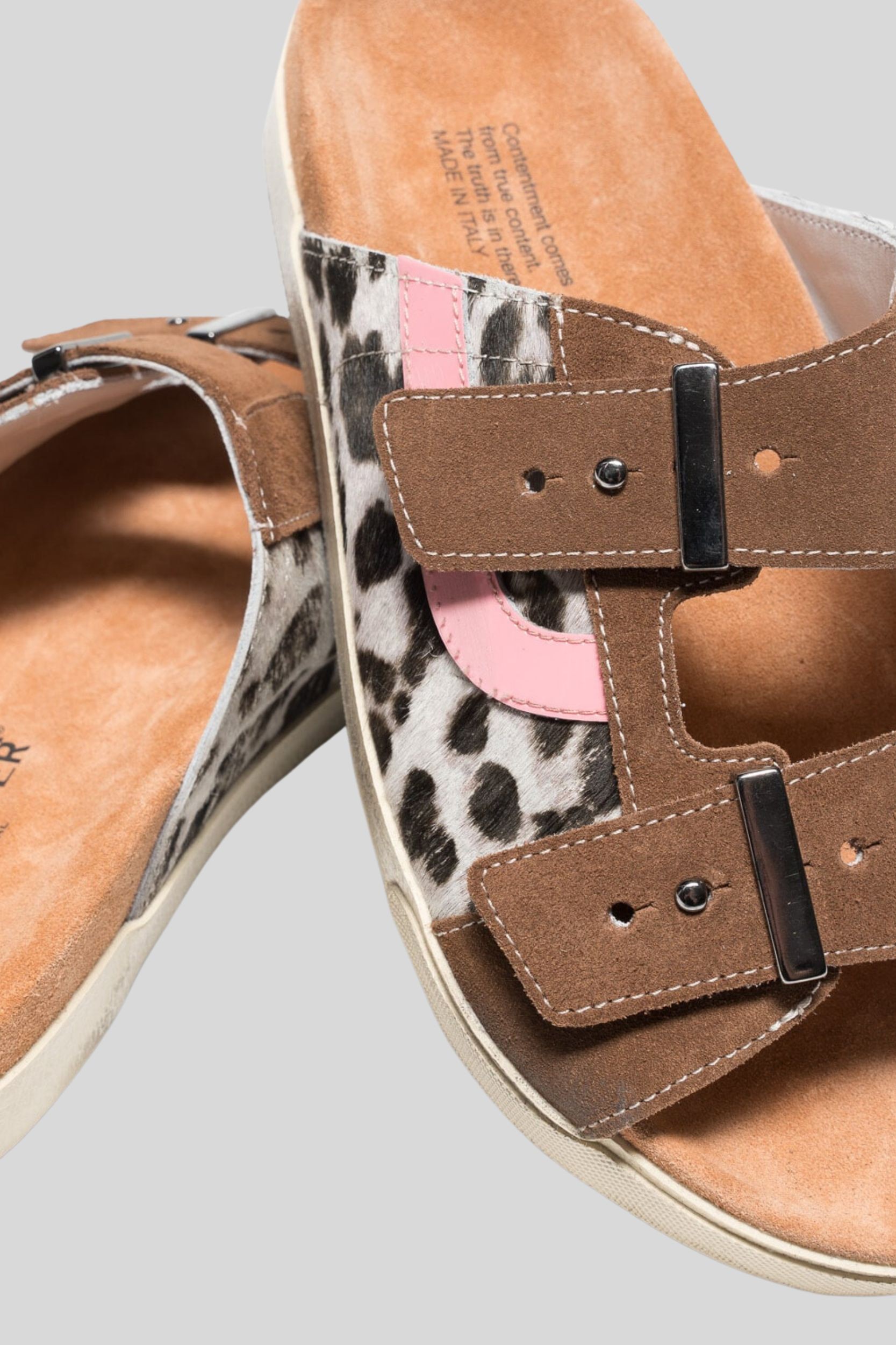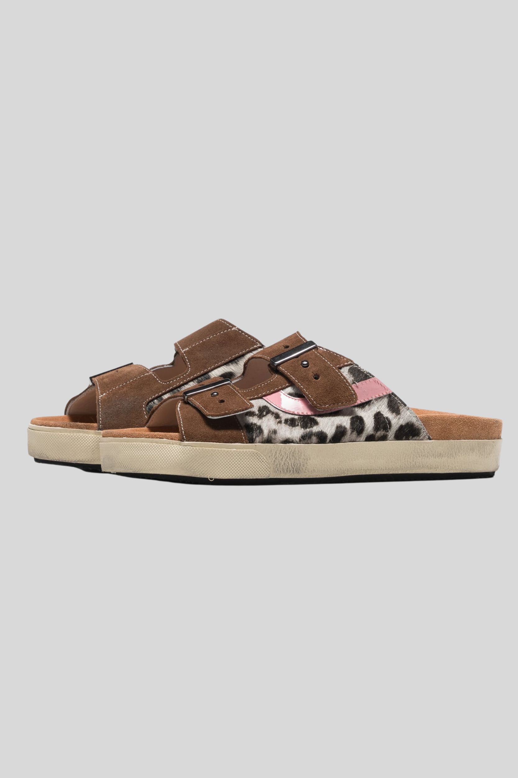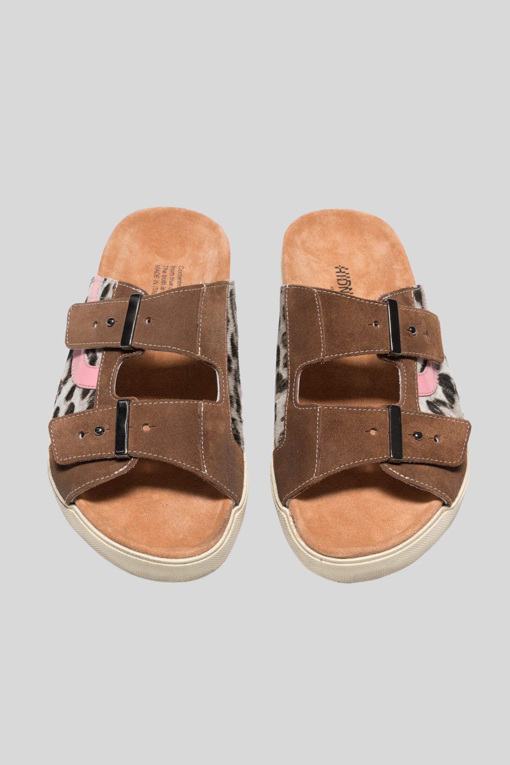 This leopard print leather Sundl sandal is designed by Hidnander. It features a casual "silp-on" look with a touch of grunge. It's made from leather and suede and features a metal buckle, EVA foam midsole and rubber outsole.